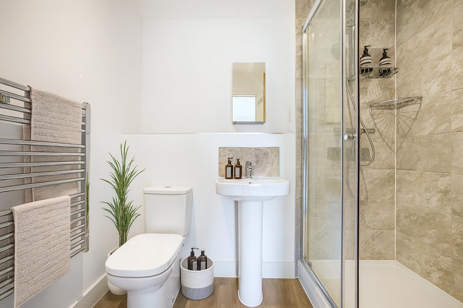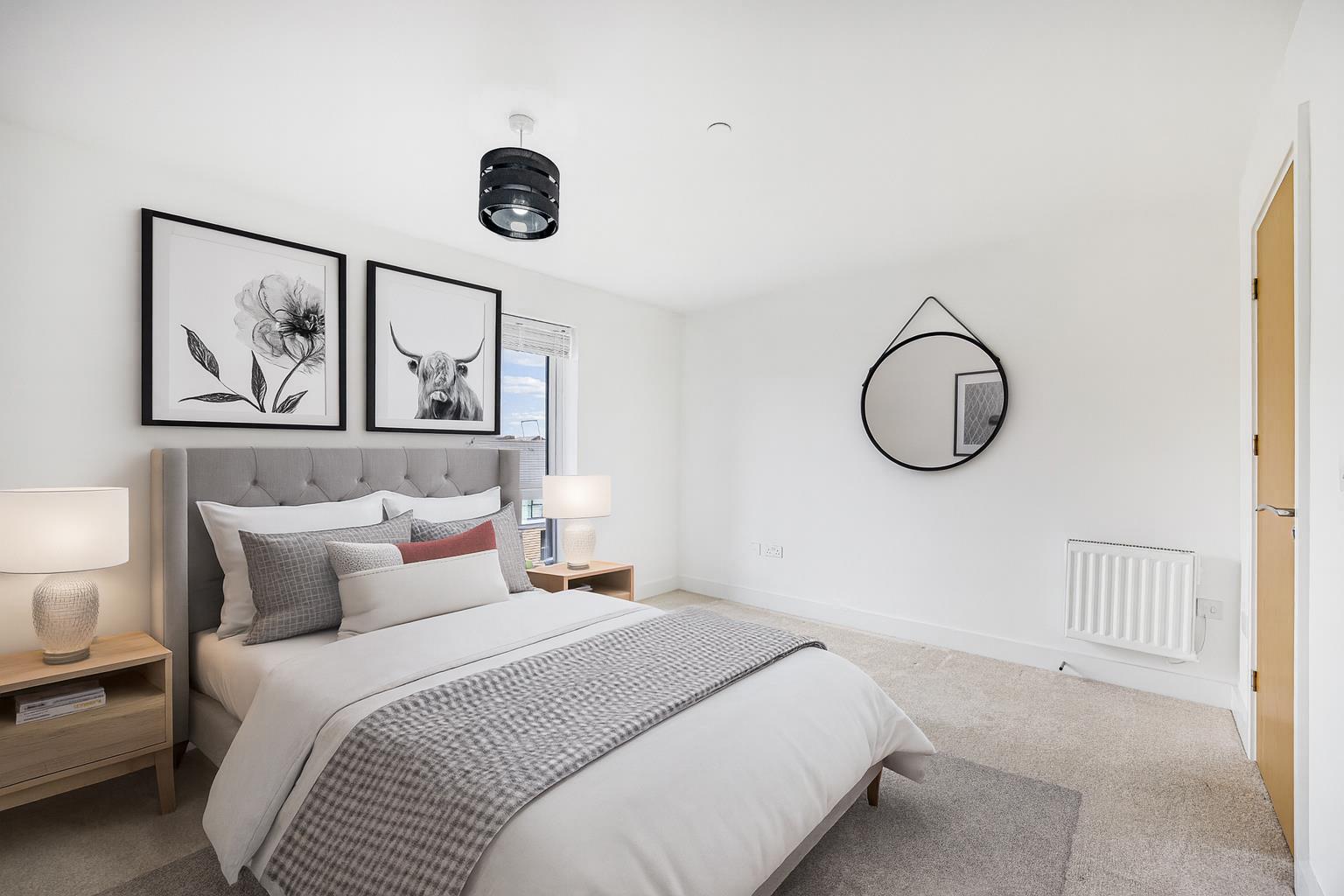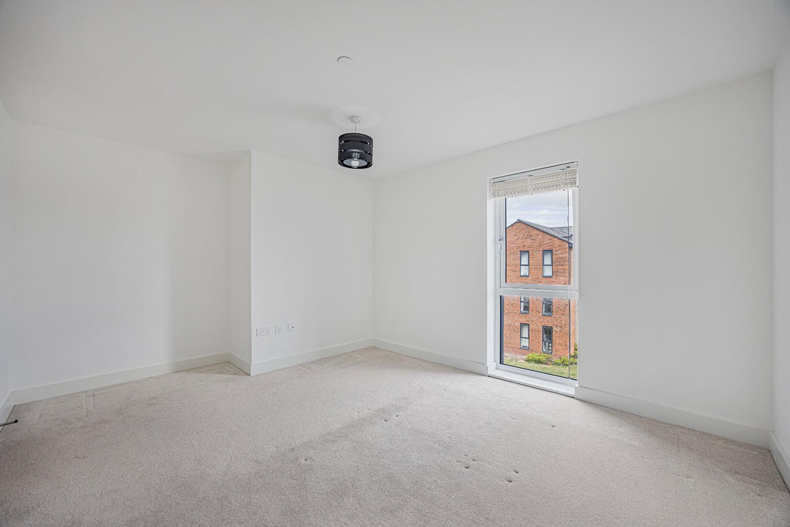 The master bedroom is a generous double with plenty of room for furniture and its own en-suite shower room, finished in neutral tones with a glass-screened shower and chrome heated towel rail. The second bedroom is also a double, with floor-to-ceiling windows and good space for freestanding furniture.