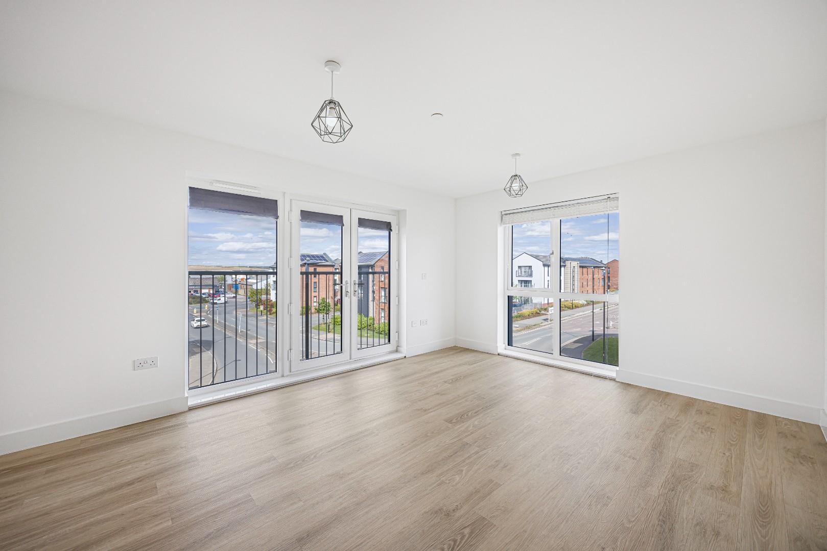 At the heart of the home is a light-filled, open-plan kitchen, living, and dining area. Floor-to-ceiling dual-aspect windows flood the space with natural light, while wood-effect vinyl flooring adds warmth and a sense of flow. The kitchen is fitted with a laminate worktop, matching splash back, integrated electric oven, ceramic hob with stainless steel splash back and extractor, plus a freestanding fridge/freezer. French doors open onto a Juliet balcony with views over the Quays, making this a bright and inviting space for relaxing or entertaining.