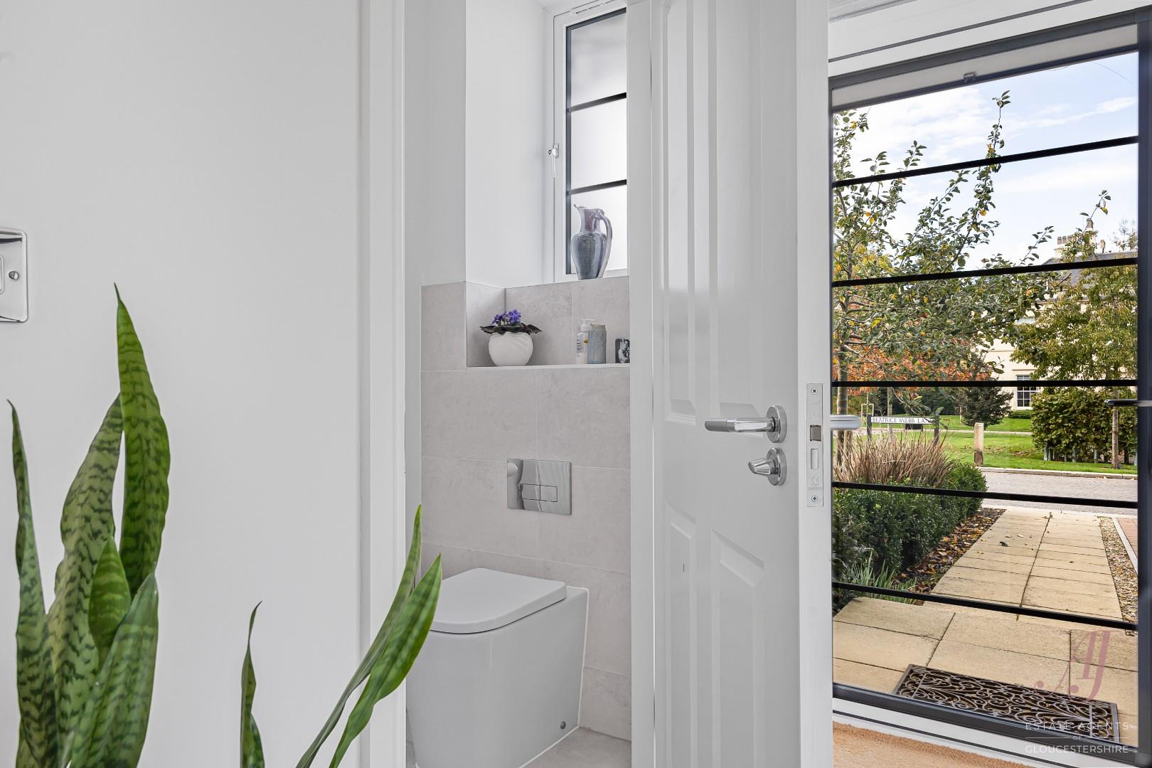 A pathway leads to the entrance hall, where a glazed front door fills the space with natural light. The hallway includes a useful cloakroom a wash basin, WC, white tiling and a window to the front.