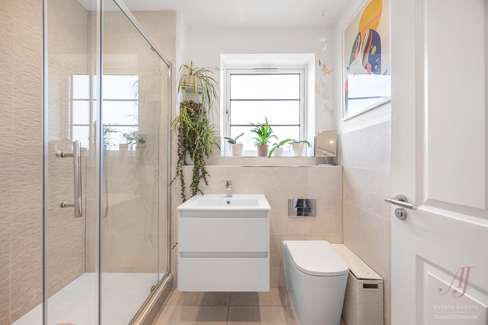 Bedroom three overlooks the rear garden and fields beyond. It can work equally well as a single bedroom or home office, with plenty of natural light from the window. The shower room is appointed in a contemporary style, featuring a large walk-in shower with rainfall head and glass screen, wall-hung vanity unit, WC, and soft neutral tiling. A window to the front provides additional light and ventilation. (original bath plumbing remains in place for those who prefer a bath.)