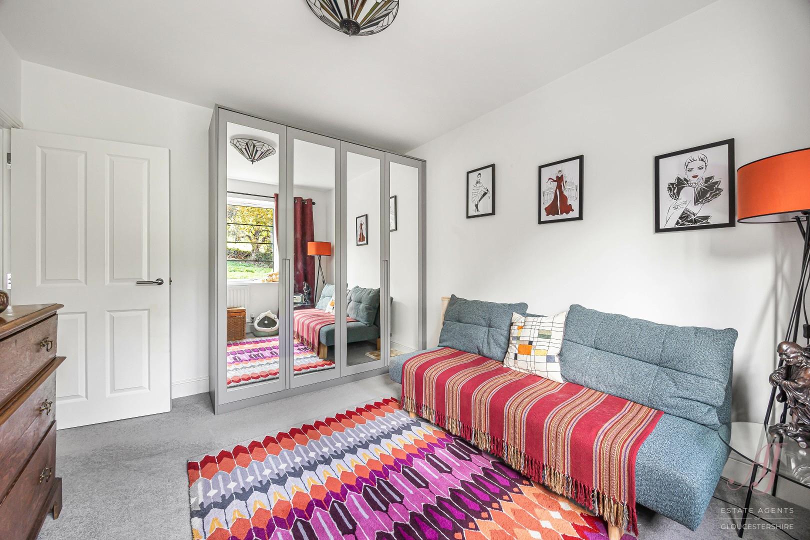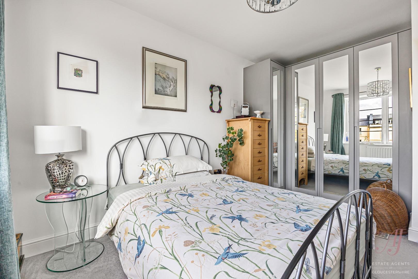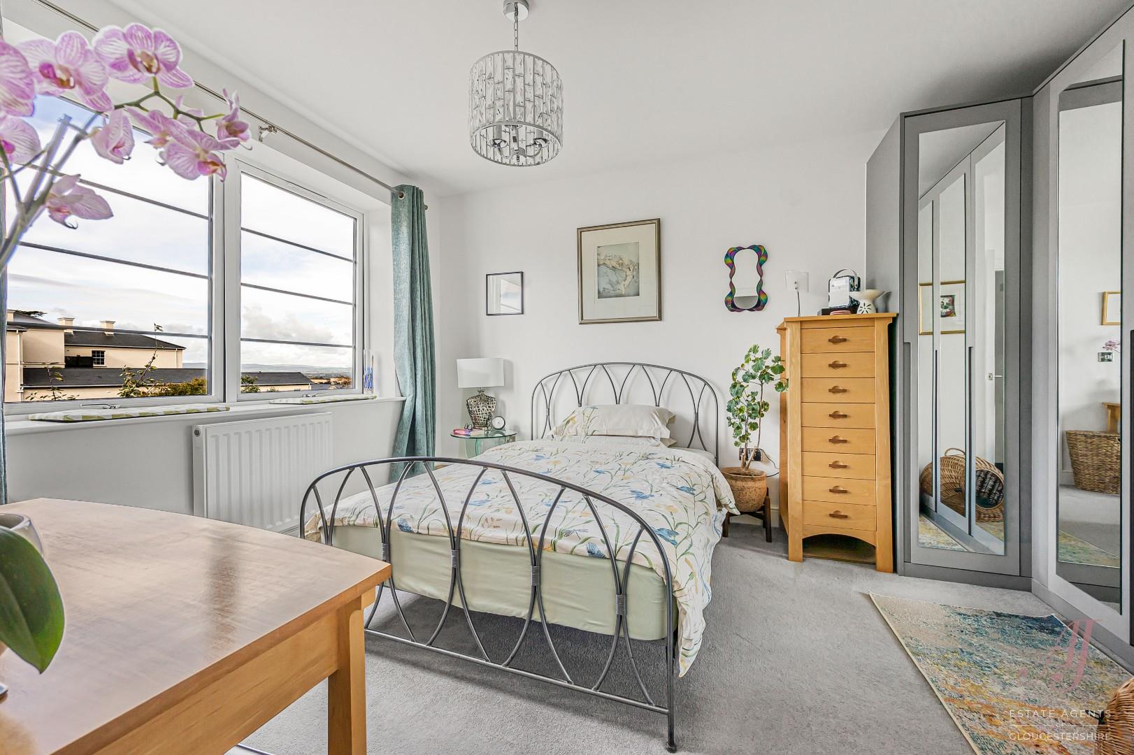 Bedroom one is a spacious double room with built-in mirrored wardrobes and a calm, elegant atmosphere. The large window frames attractive views toward the Severn and the Forest of Dean and offers a wealth of natural light.