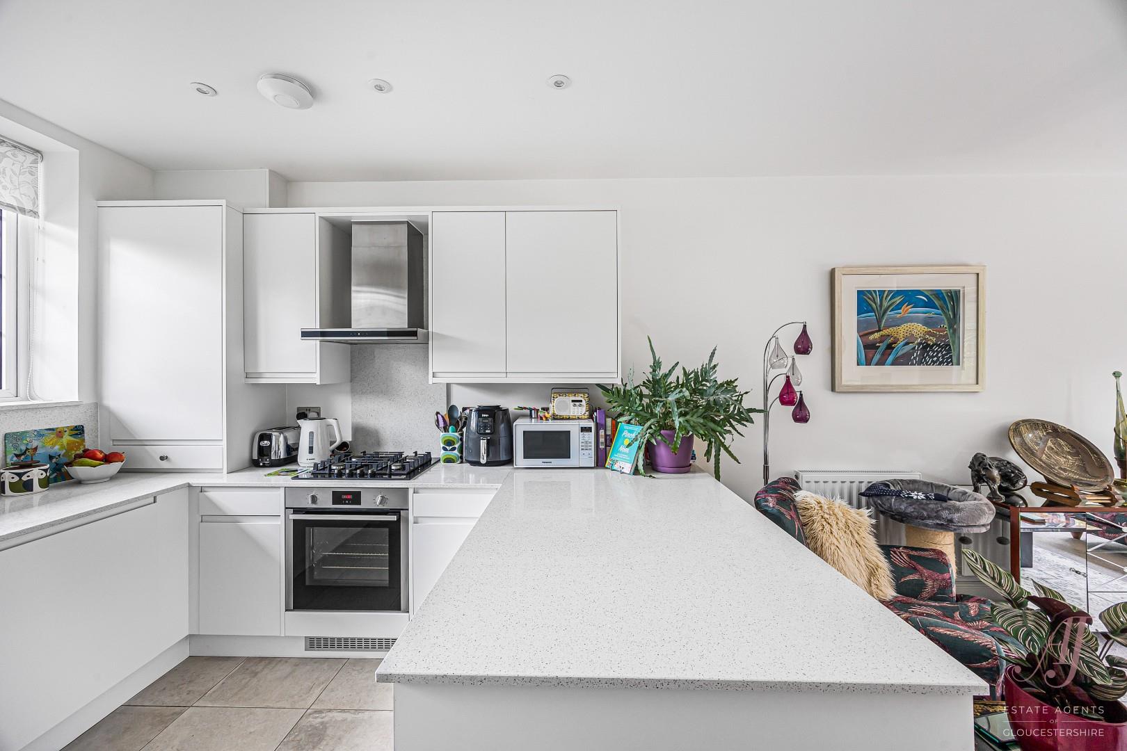 From the hallway, a door opens into the bright open-plan living area which is the heart of the home. The stylish breakfast kitchen features white base and wall units, quartz-style worktops, and a generous breakfast bar ideal for casual dining or entertaining. Integrated appliances include an oven, hob with extractor, dishwasher, and fridge-freezer. Large windows and tiled flooring enhance the clean, modern aesthetic.