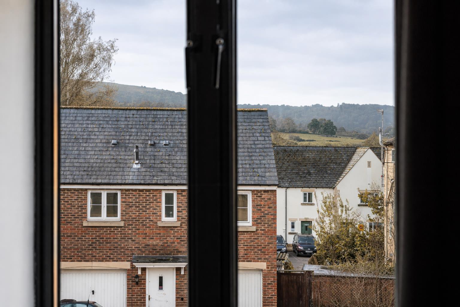 There are three well-proportioned double bedrooms, each enjoying plenty of natural light. The master bedroom includes fitted wardrobes, a large casement window, and an en-suite shower room. A second double bedroom features views toward Selsley, while the third also benefits from a pleasant front outlook. Bedrooms one and two have newly fitted neutral carpets. A well-sized family bathroom completes the accommodation.