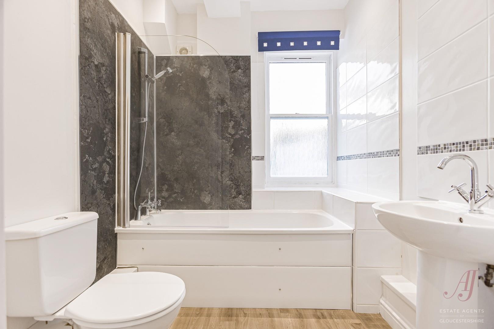 The accommodation is finished with a newly fitted bathroom. An opaque window brings in strong natural light while maintaining privacy. The room includes a white suite with panelled bath and overhead shower, a pedestal basin, and a low-level WC.