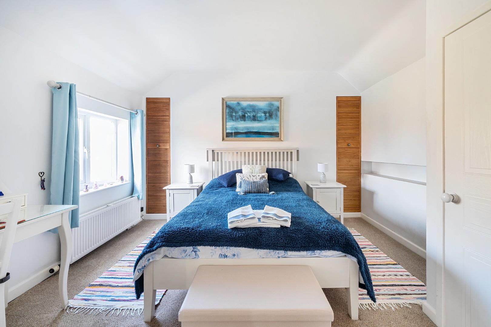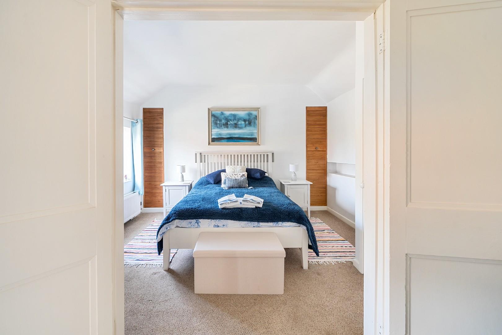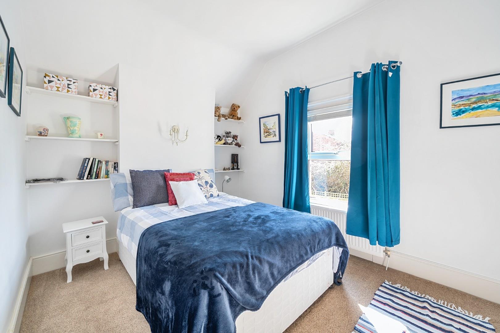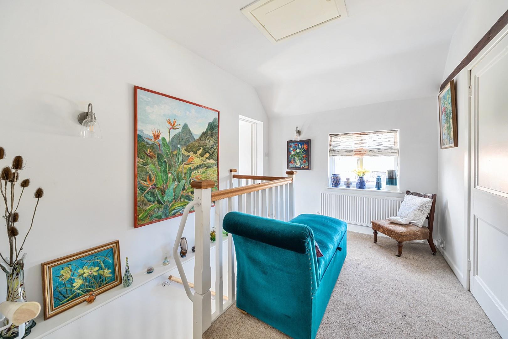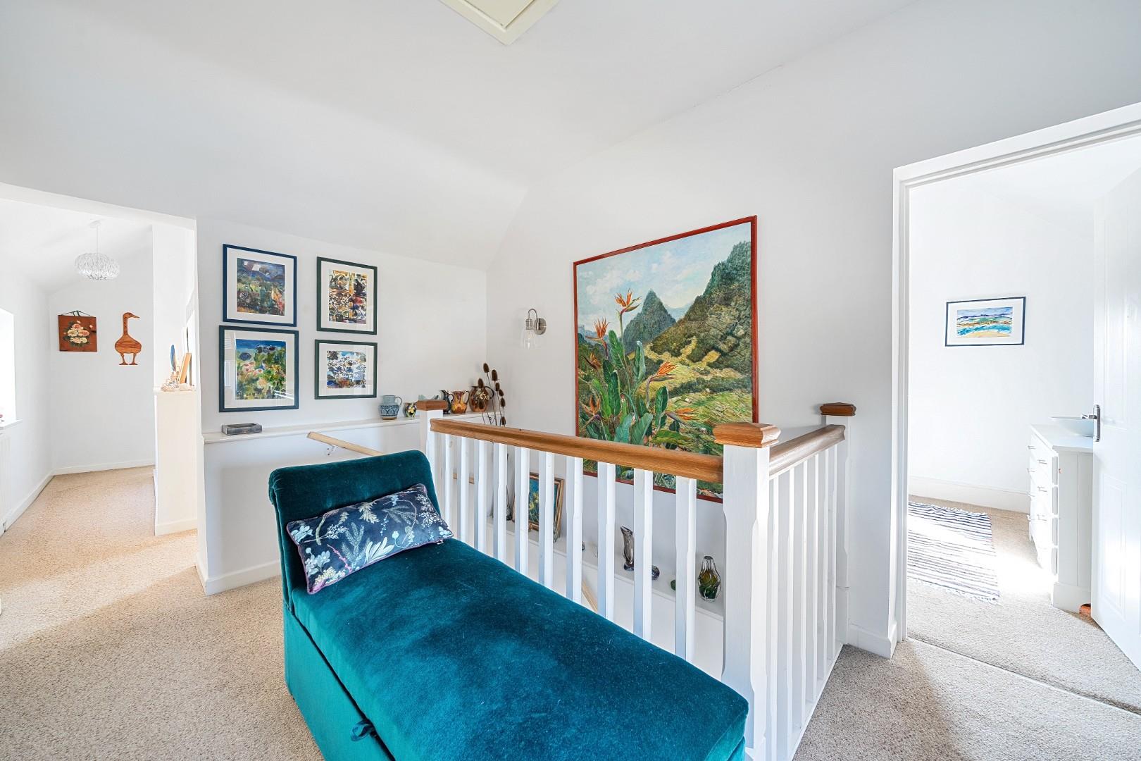Upstairs, a gently rising staircase leads to a galleried landing with painted spindles and oak banisters. A lovely L shaped landing with access to four delightful bedrooms all have a wealth of light and complimented by a four-piece bathroom. Window to the front on the landing with access to Bedroom one is a spacious and serene retreat, with a large window offering pleasant views and space for wardrobes and free standing furniture. Bedroom two, a double bedroom also at the front of the house, features built-in wardrobes and enjoys similar leafy views. Bedroom three a double and bedroom four a single room are located at the rear, both generous in size, and offer lovely views across the garden, perfect for children, guests, or as additional home working spaces.