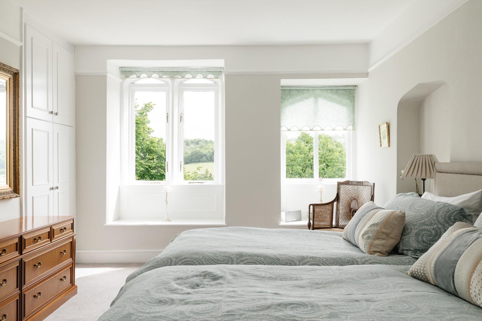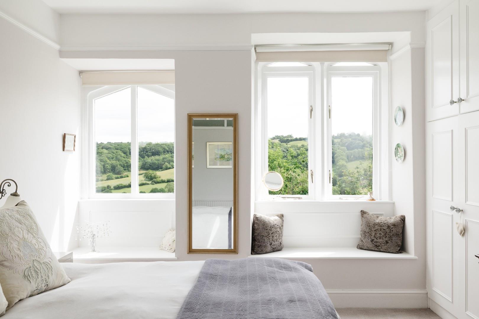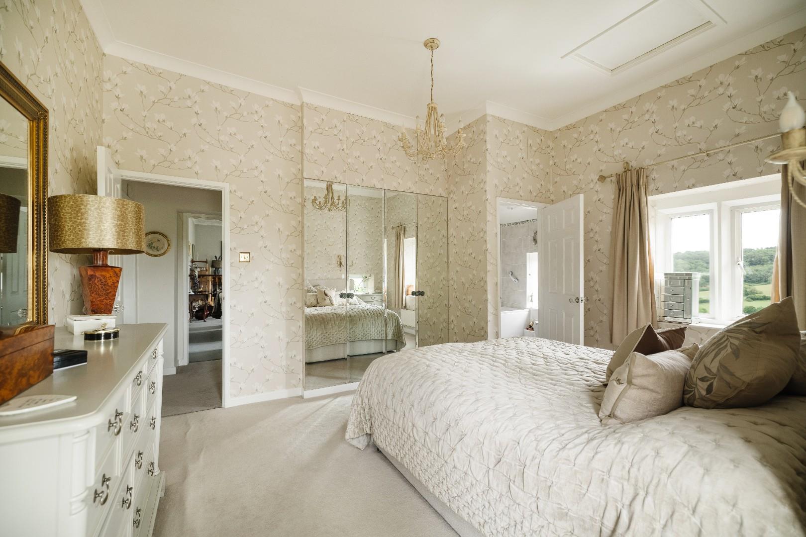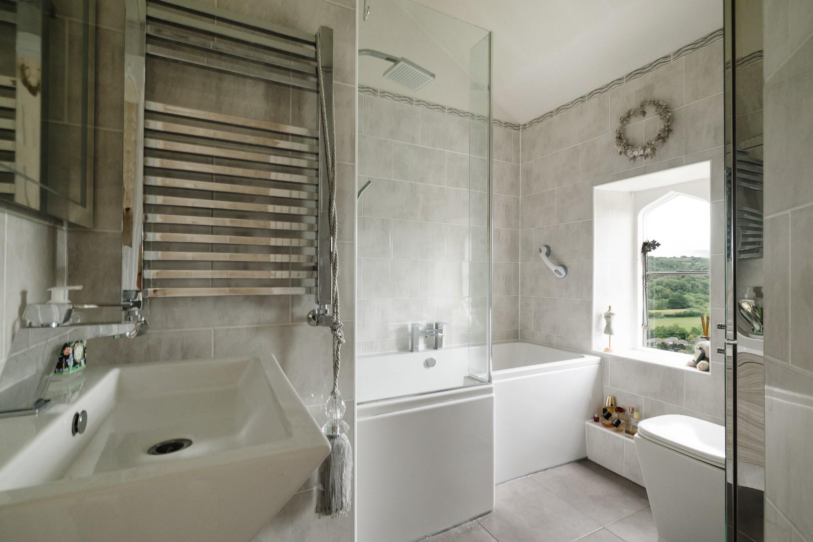 Master Bedroom is a serene retreat with widows to the front and side, French doors open to the sun terrace, a range of fitted wardrobes and door to the ensuite bathroom. Comprising a modern L shaped bath with overhead rainfall shower, heated towel rail, basin and low flush WC. A stunning gothic window provides views across the valley. As a master bedroom a luxurious and serene retreat.