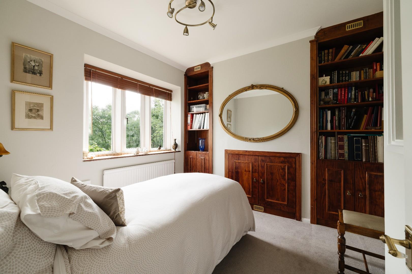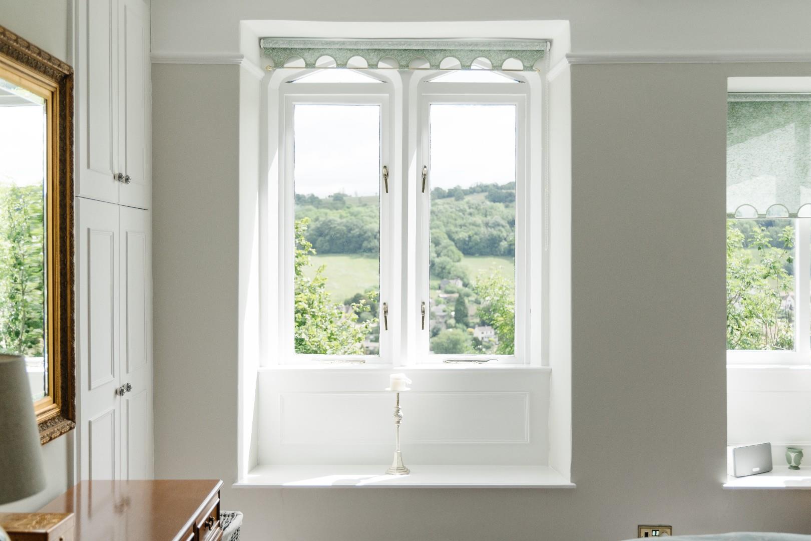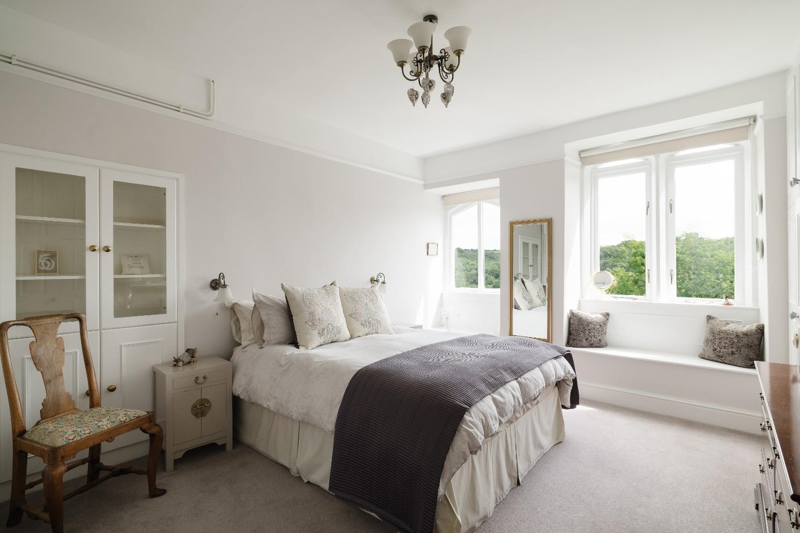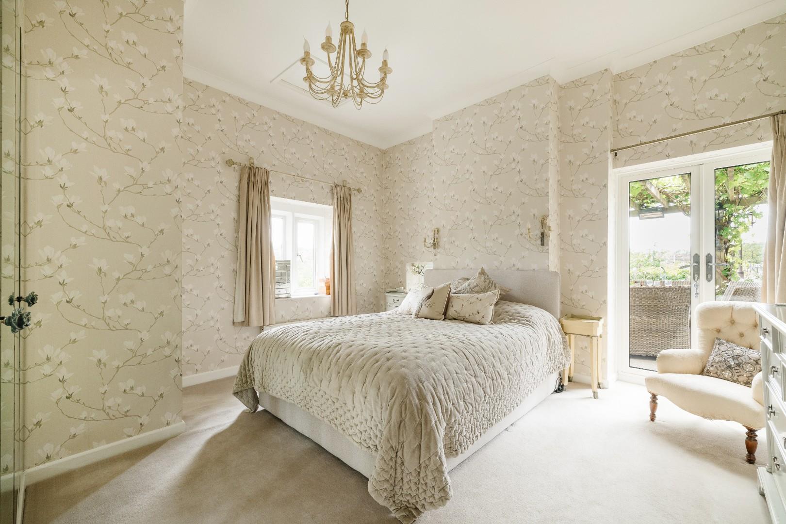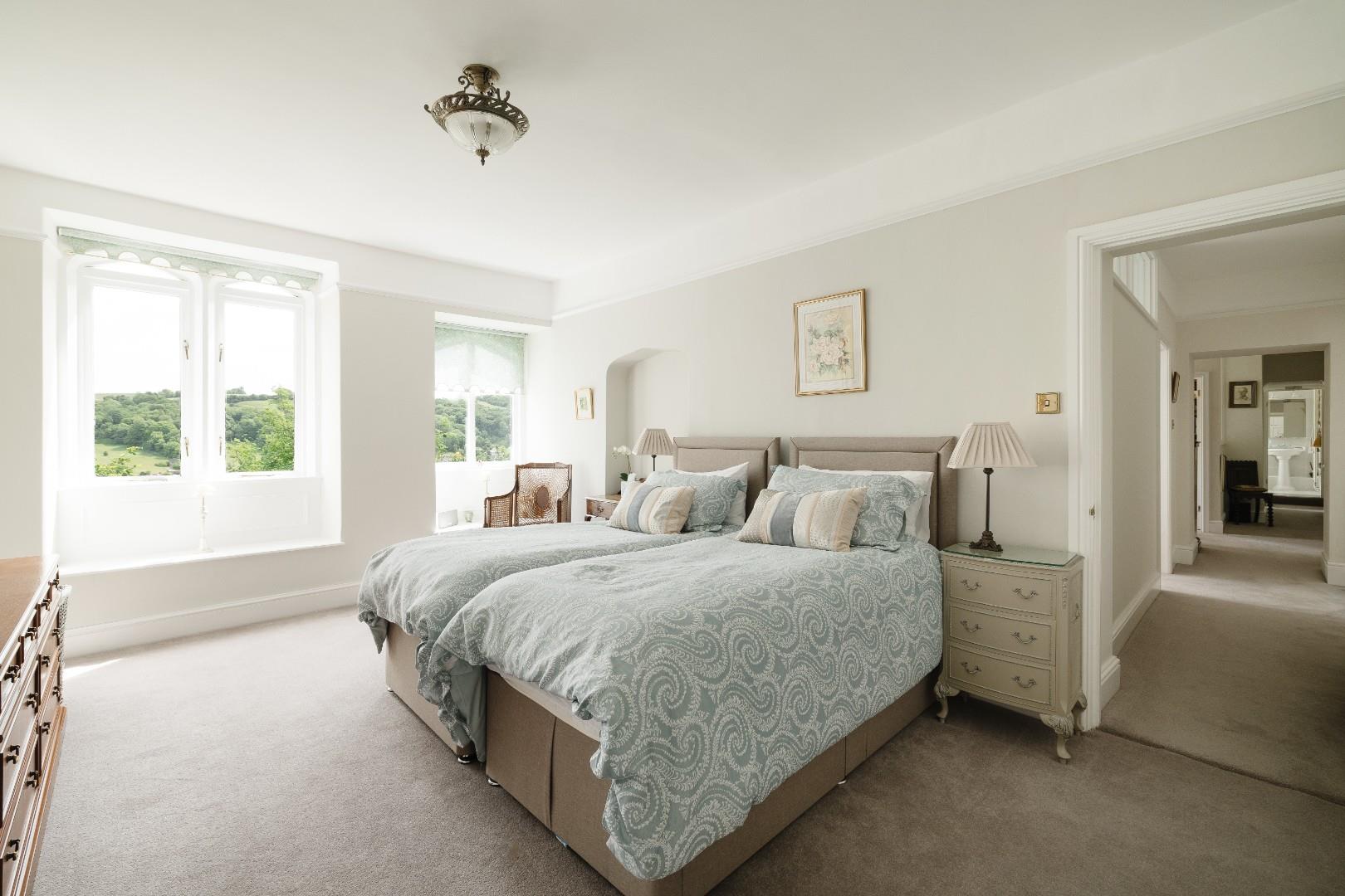 Master Bedroom is a serene retreat with widows to the front and side, French doors open to the sun terrace, a range of fitted wardrobes and door to the ensuite bathroom. Comprising a modern L shaped bath with overhead rainfall shower, heated towel rail, basin and low flush WC. A stunning gothic window provides views across the valley. As a master bedroom a luxurious and serene retreat.