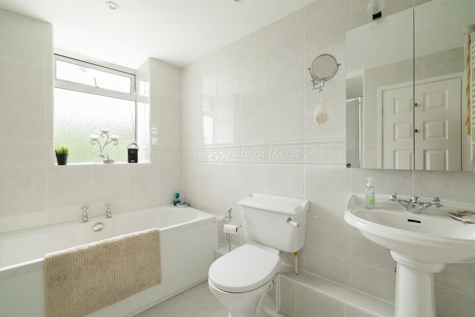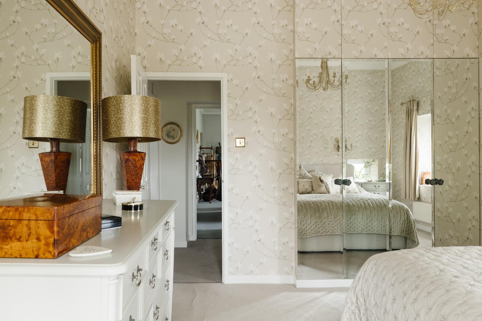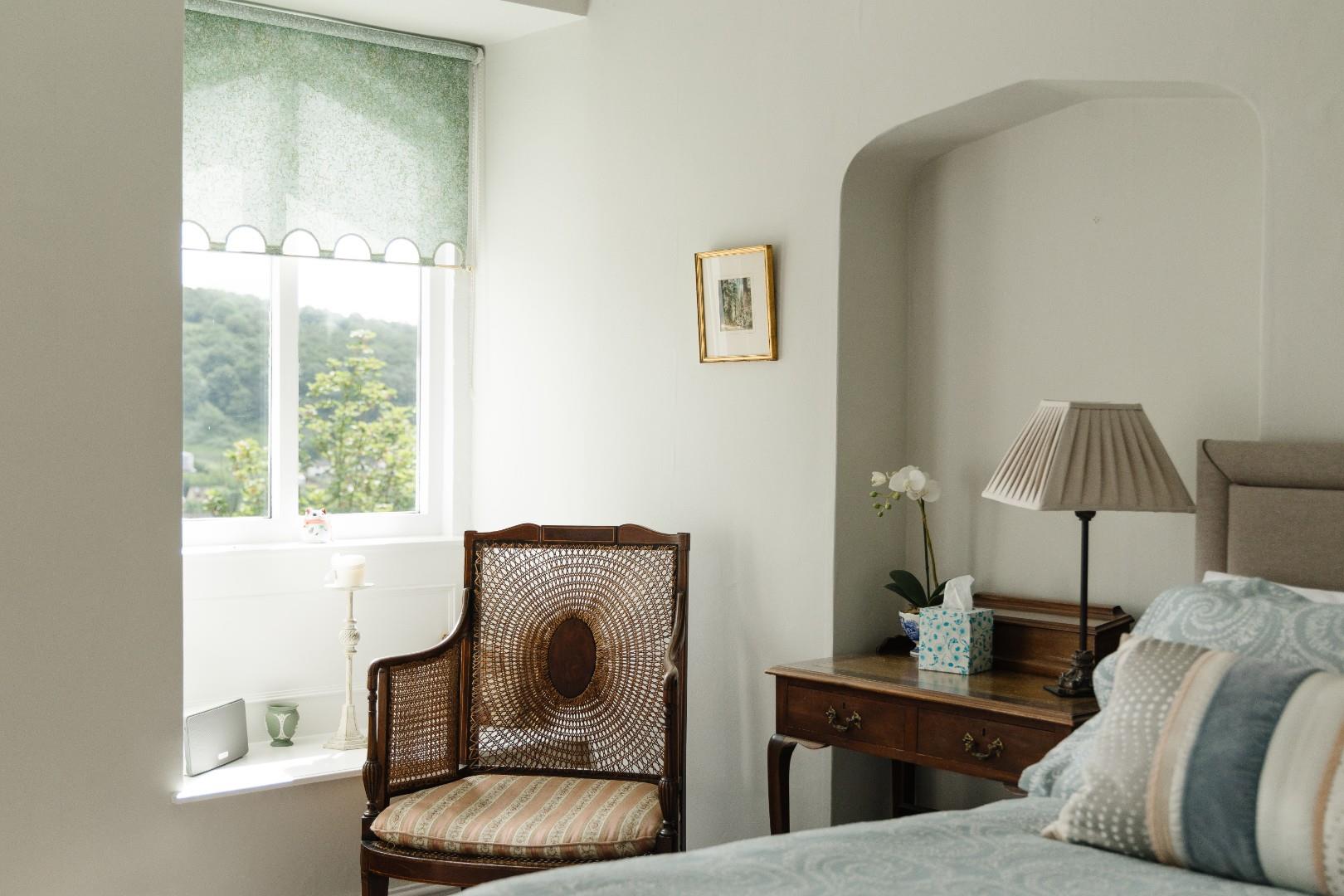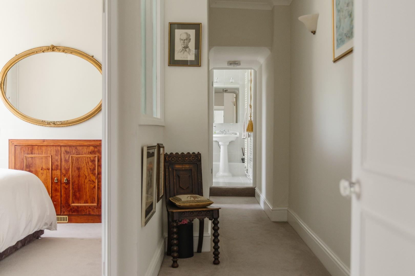 Master Bedroom is a serene retreat with widows to the front and side, French doors open to the sun terrace, a range of fitted wardrobes and door to the ensuite bathroom. Comprising a modern L shaped bath with overhead rainfall shower, heated towel rail, basin and low flush WC. A stunning gothic window provides views across the valley. As a master bedroom a luxurious and serene retreat.
