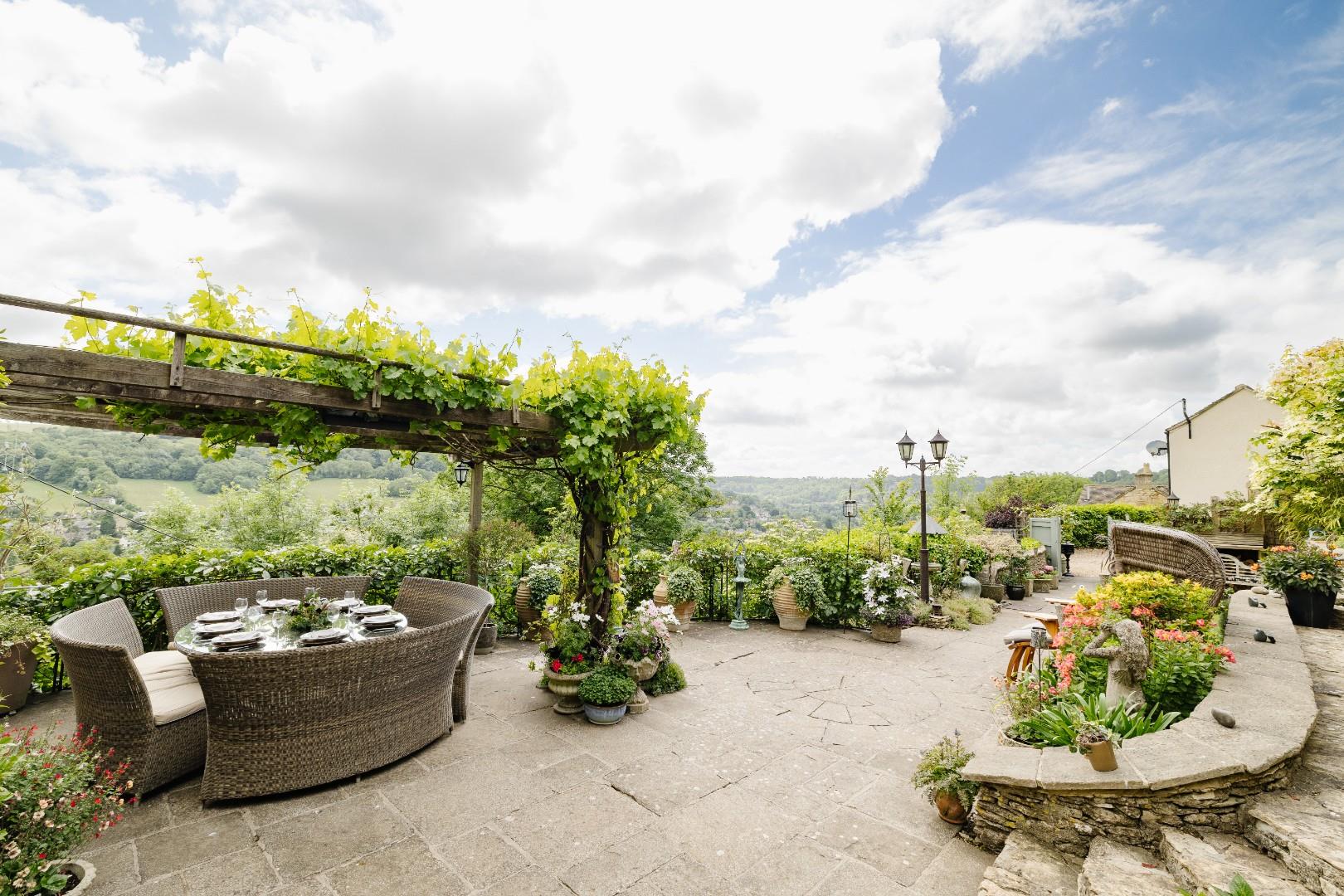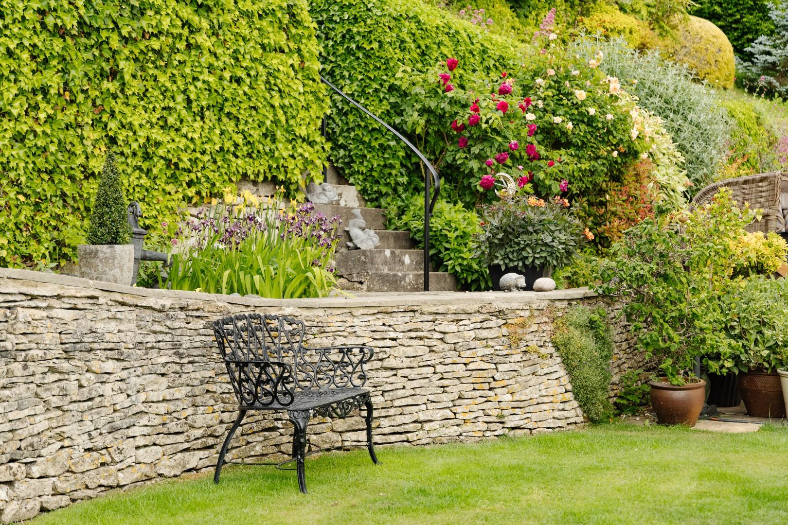 The grounds have been thoughtfully landscaped to deliver both visual impact and a deep sense of tranquility. Set into the hillside, the gardens at Fort William are a true highlight, across tiered levels, the outdoor space blends formal structure with cottage garden charm. Throughout colourful borders rich with roses, irises, peonies, and flowering shrubs that bring seasonal scent and texture. Stone steps rise elegantly through lush planting, framed by dry-stone walls and ivy-covered terraces that create a timeless, secluded atmosphere. A chipping pathway winds through green zones and secret seating spots, while sculpted box, ornamental grasses, and well-placed planters bring a balance of wild beauty and structured elegance. A private terrace, ideal for morning coffee or evening dining, sits at the lower level, offering space for outdoor entertaining and quiet reflection alike. The panoramic views are simply exceptional, sweeping across the Cotswold valley with its rolling hills, treetops, and scattered village rooftops. Whether from the kitchen, terrace, or upper floors, the outlook stretches uninterrupted to the horizon, capturing golden morning light and long summer sunsets. This sense of elevation and privacy enhances the serenity of the home, making it feel both connected to nature and wonderfully removed from the bustle of everyday life. Mature trees and hedging provide natural screening.