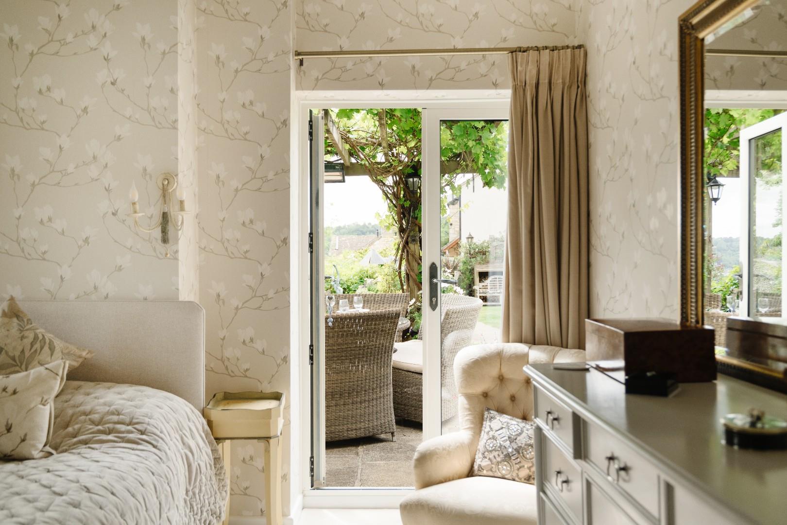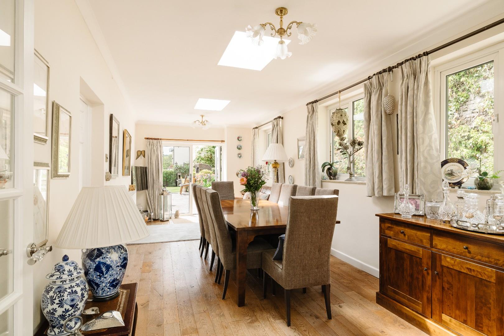 - Dining room with glazed doors open directly onto the garden for seamless indoor/outdoor living.