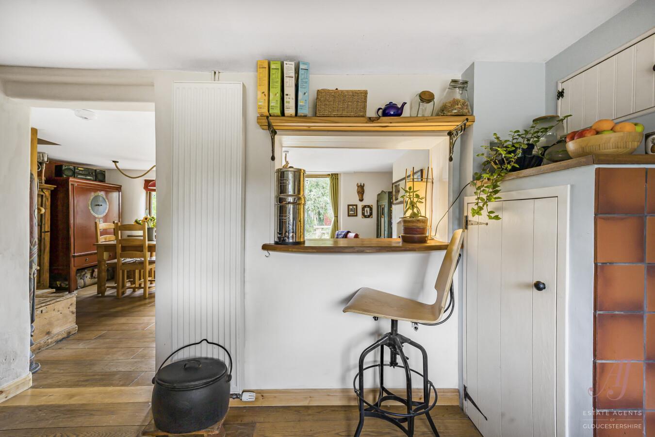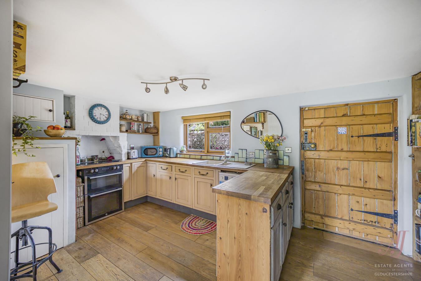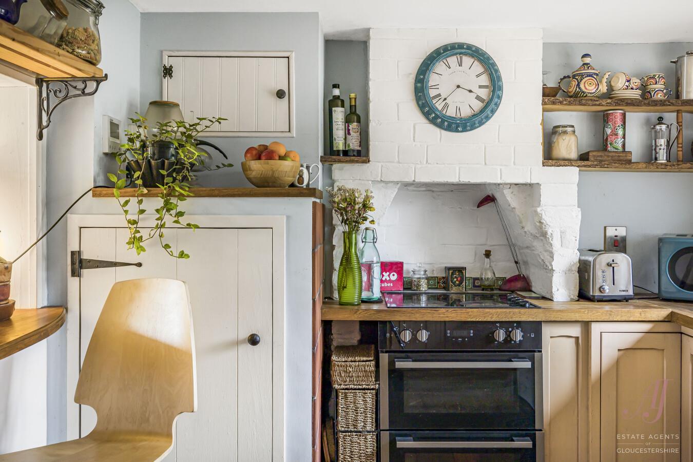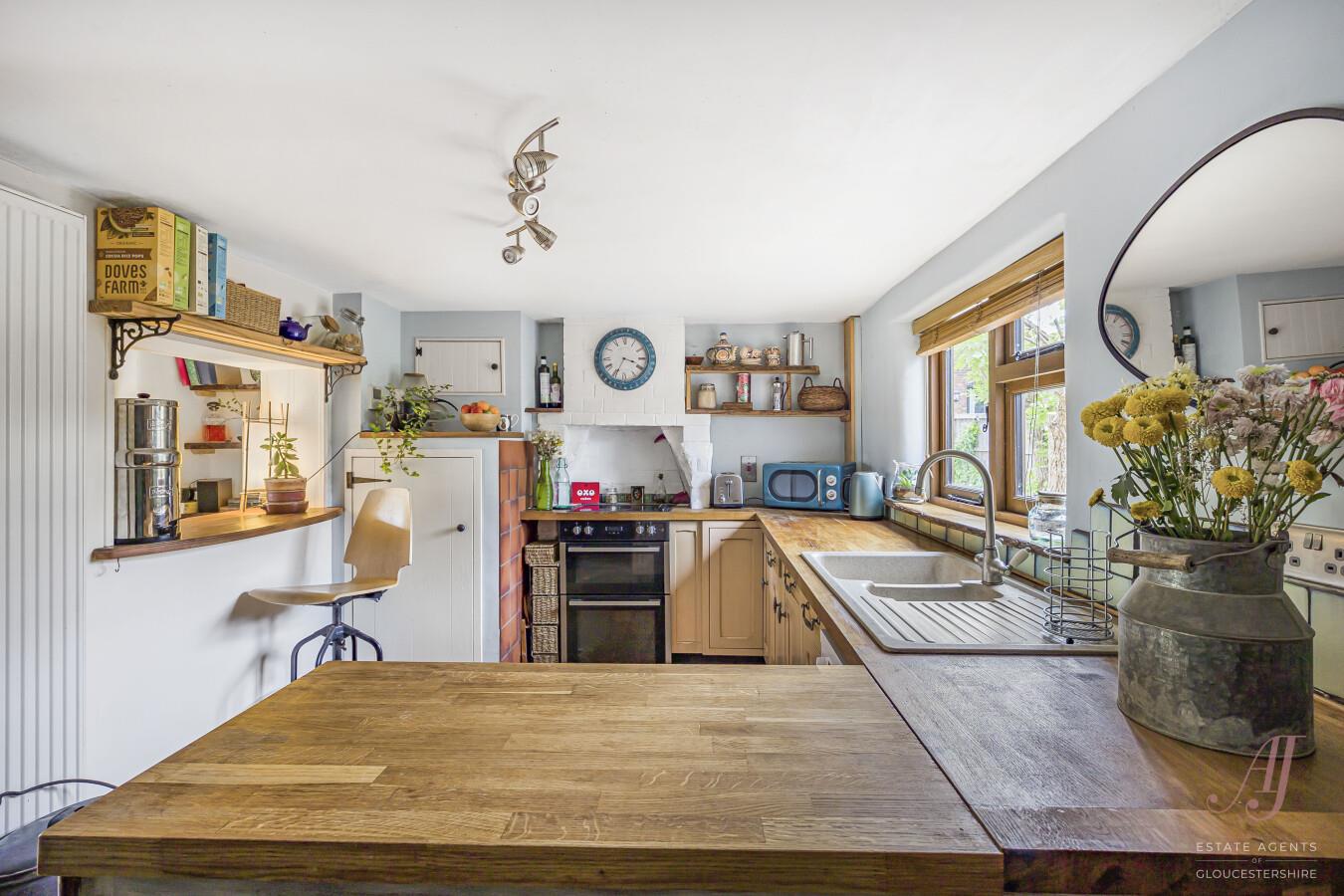Traditional fitted kitchen with cream units, complimented by wooden worktops, window sill with exposed bark edging, built-in double oven & hob set within a white brick alcove and timber shelving. A wealth of natural light streams through the window above the sink and from the hatchway to the living area. Throughout a beautiful blend of wood, brick, & painted finishes. Serving hatch and opening provides views and access to the sitting/dining room. Completed by engineered oak flooring which continues throughout the ground floor.