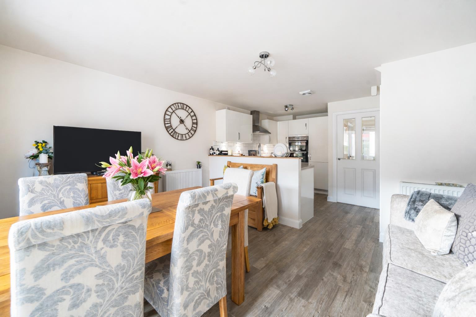 A fully fitted kitchen with a range of base units and wall mounted gloss cabinets in a white with a good amount of work top space, under unit lighting, composite sink & drainer inset with hose tap, white tiled surround. A range of built-in appliances to include, four ring gas hob, extractor, eye level double oven, dishwasher and fridge/freezer. Also having a fantastic under stairs pantry with fitted shelving perfect for a busy family.