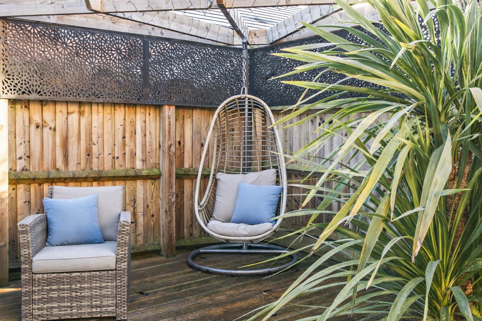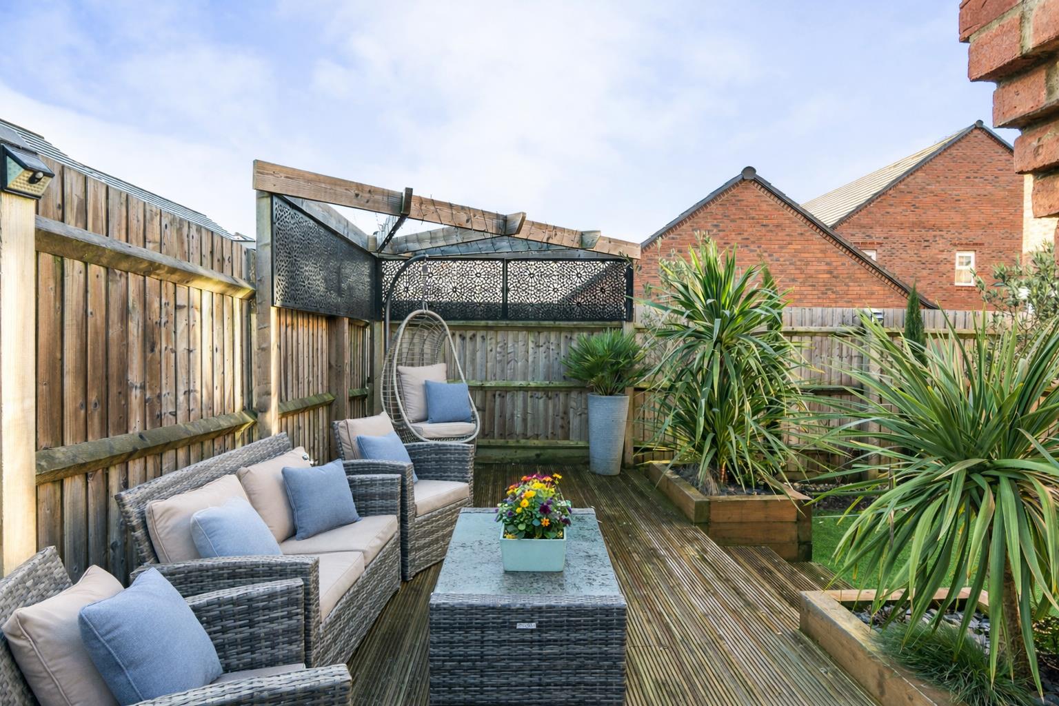 Steps lead up to a decked seating area at the rear, set up as a calm spot for outdoor dining or evening drinks.