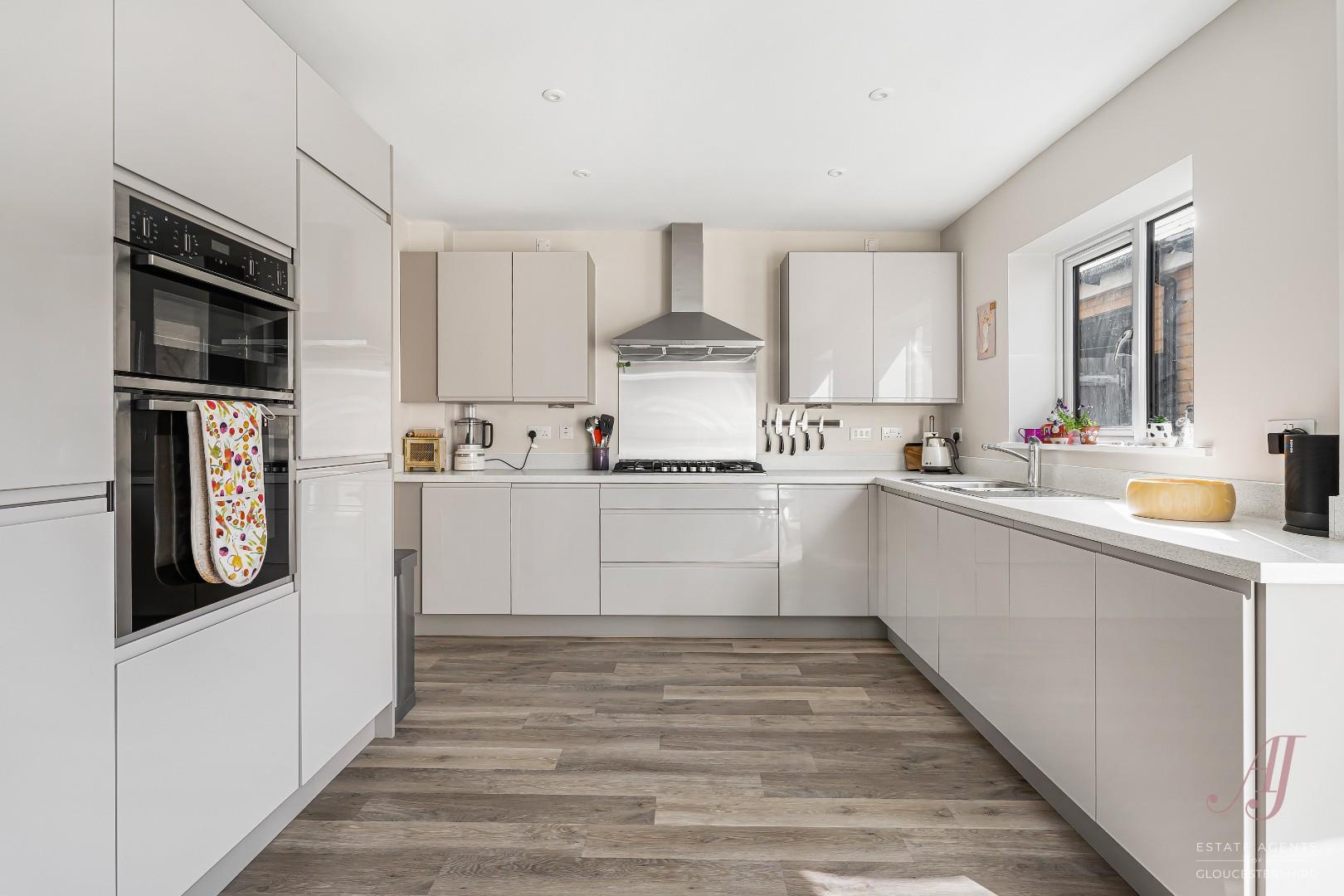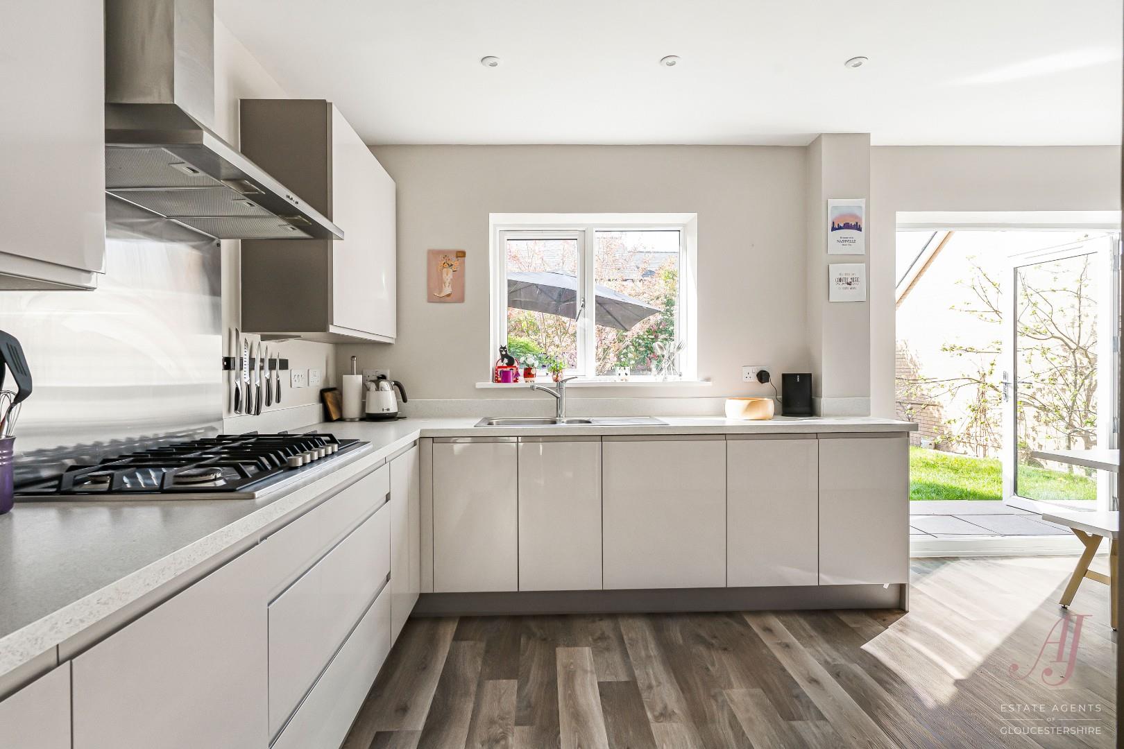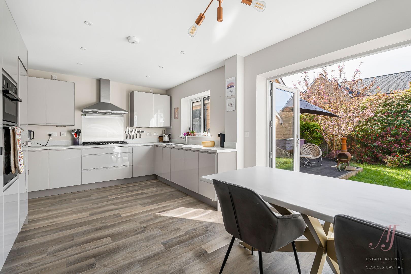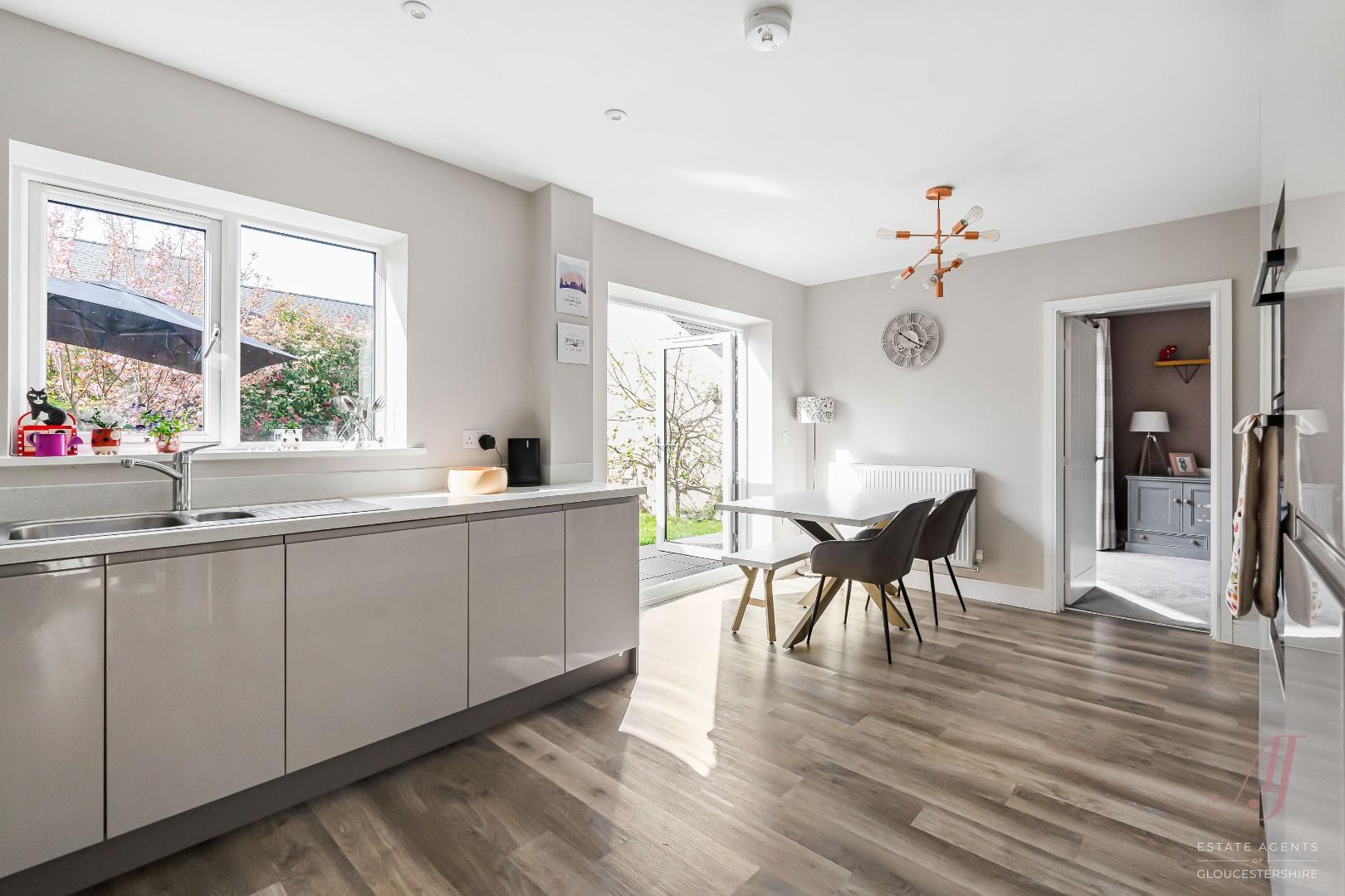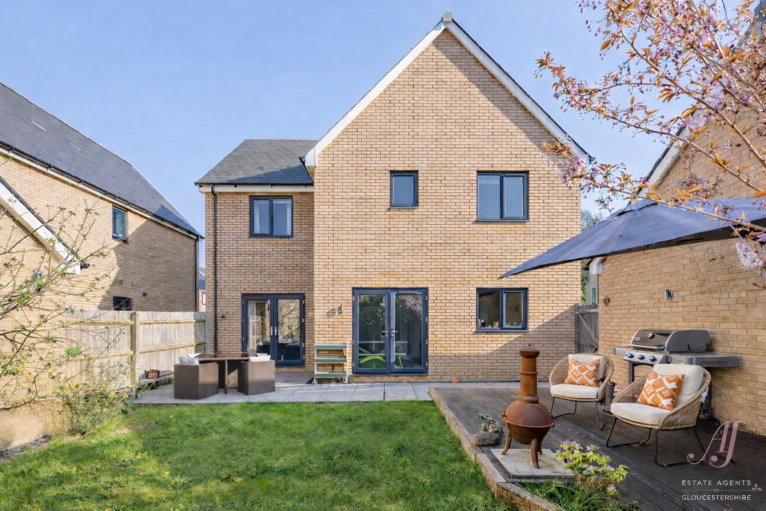 OFFERED WITH NO ONWARD CHAIN. A beautifully presented four bedroom detached family home, set within a quiet cul de sac on the sought after Littlecombe development in Dursley. Built by St Modwen Homes in 2019 to the popular ‘Garnet’ design, the property offers light, airy and well balanced accommodation, ideal for modern family living. The ground floor includes a spacious sitting room with window to the front and French doors to the garden, a fitted dining kitchen with white units, integrated appliances and French doors opening out for indoor/outdoor living, a separate utility room with external access, and a second reception room ideal as a playroom, snug or home office. Upstairs, a striking double height landing with feature window creates a real sense of space, leading to a well arranged master suite with dressing area and en suite shower room, along with three further bedrooms. Bedrooms to the front enjoy an attractive outlook over the green, while rear rooms overlook the garden. Further benefits include driveway parking for two vehicles, a garage with power and lighting, an enclosed rear garden accessed from both main living areas, and the reassurance of the remaining NHBC warranty. A fantastic family home offering space, flexibility and a modern layout in a popular and well regarded development.