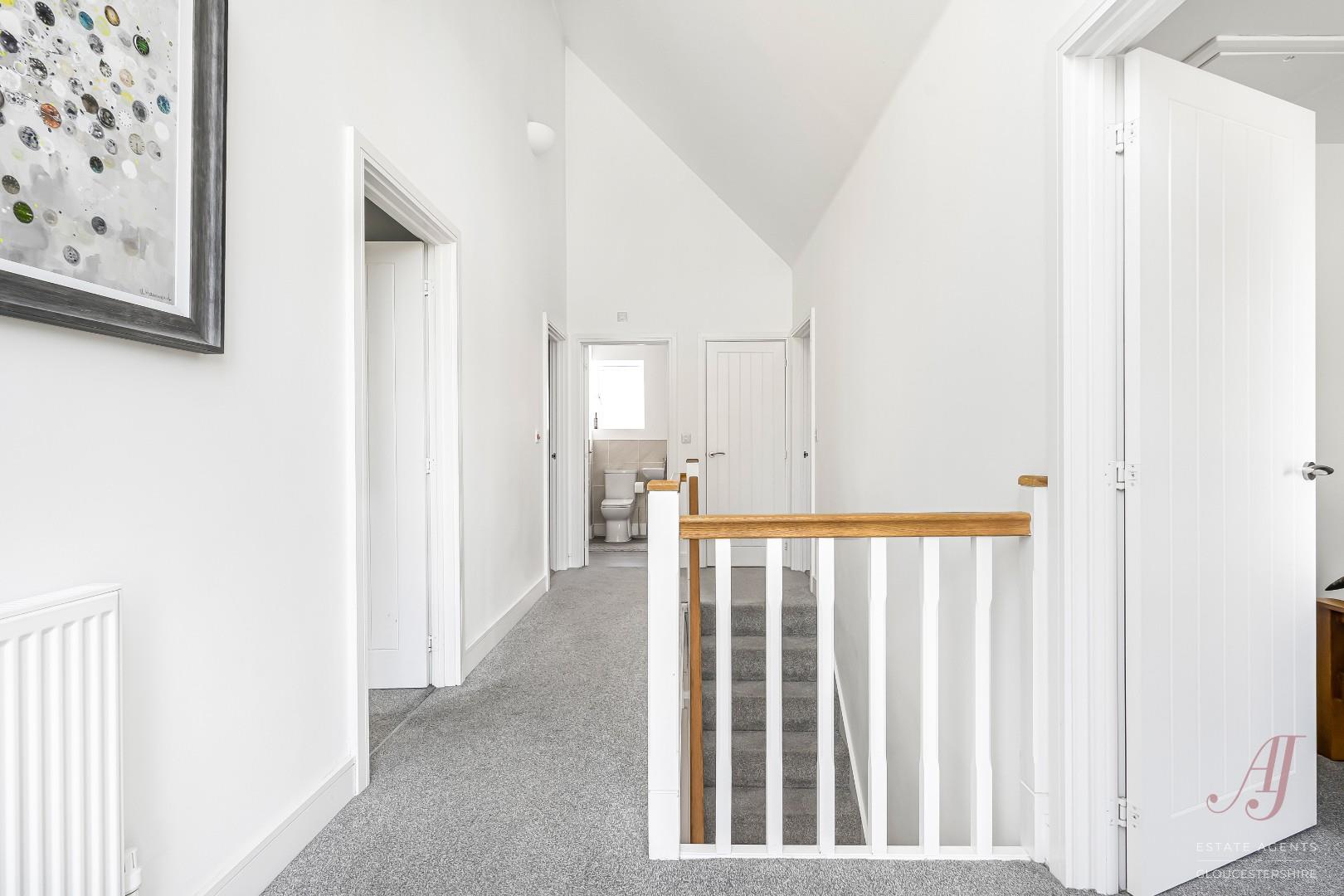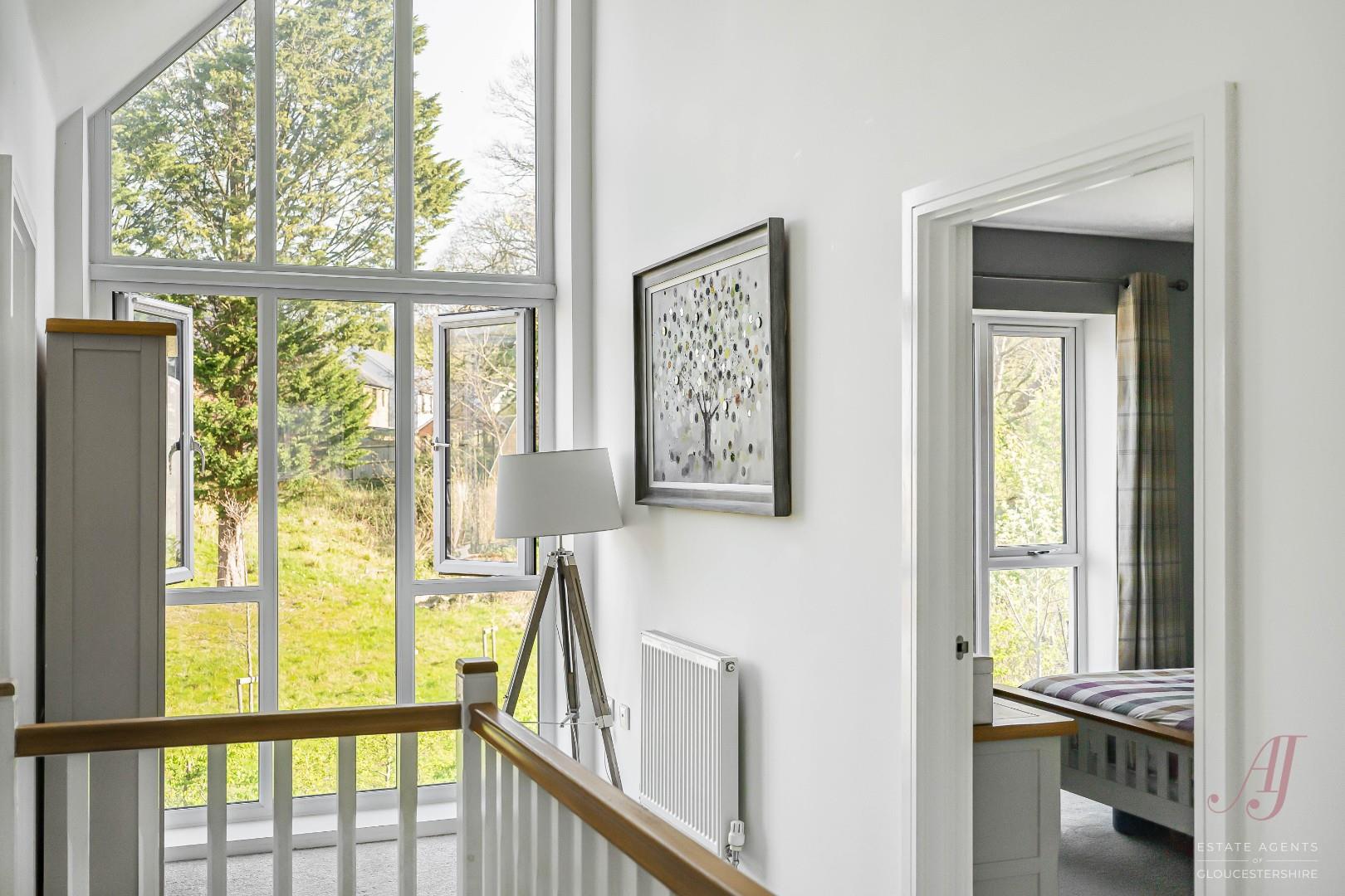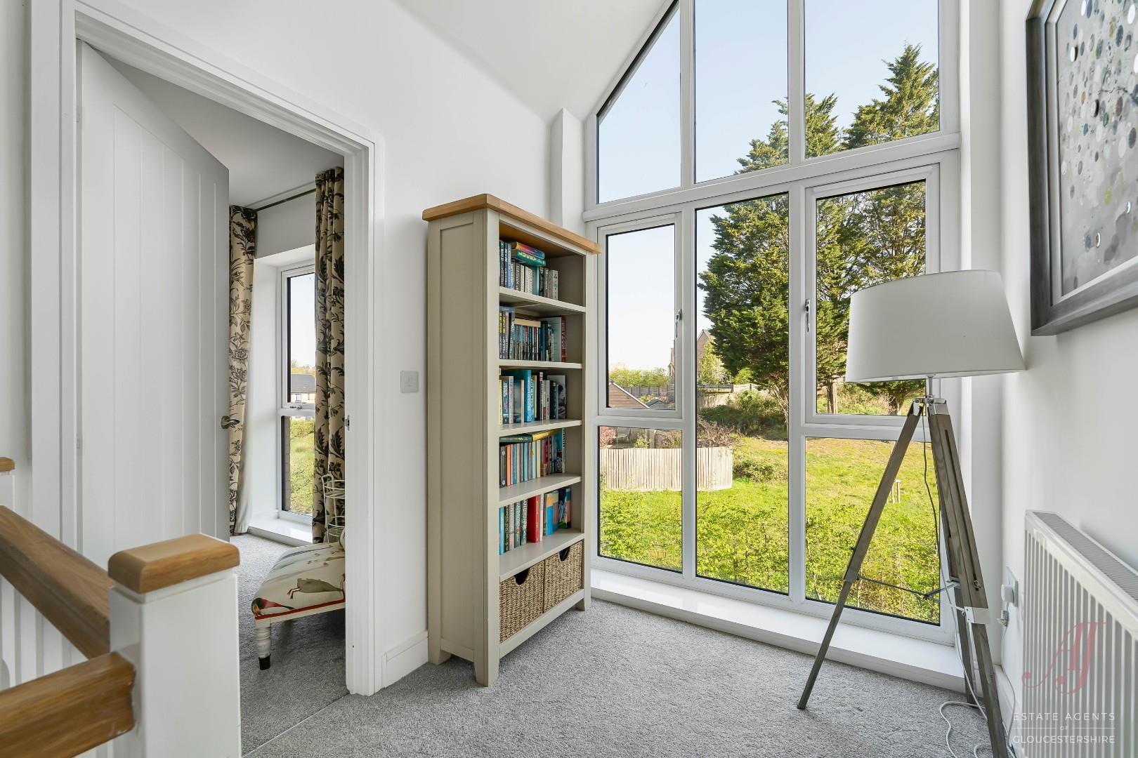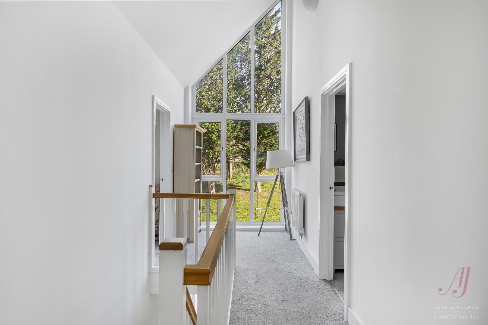 Upstairs, the landing is a striking feature, designed with a double height ceiling and a large floor to ceiling window. This creates a bright and airy feel, adding a sense of space and a more contemporary design compared to a more traditional layout. There is also space for a desk or reading area if required, with doors leading to all bedrooms and the family bathroom.
