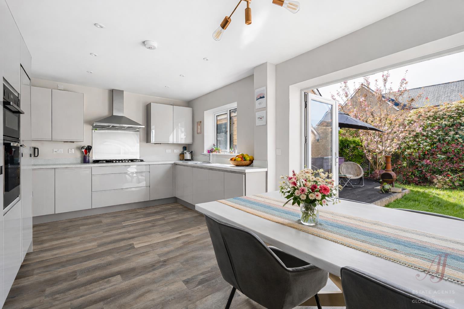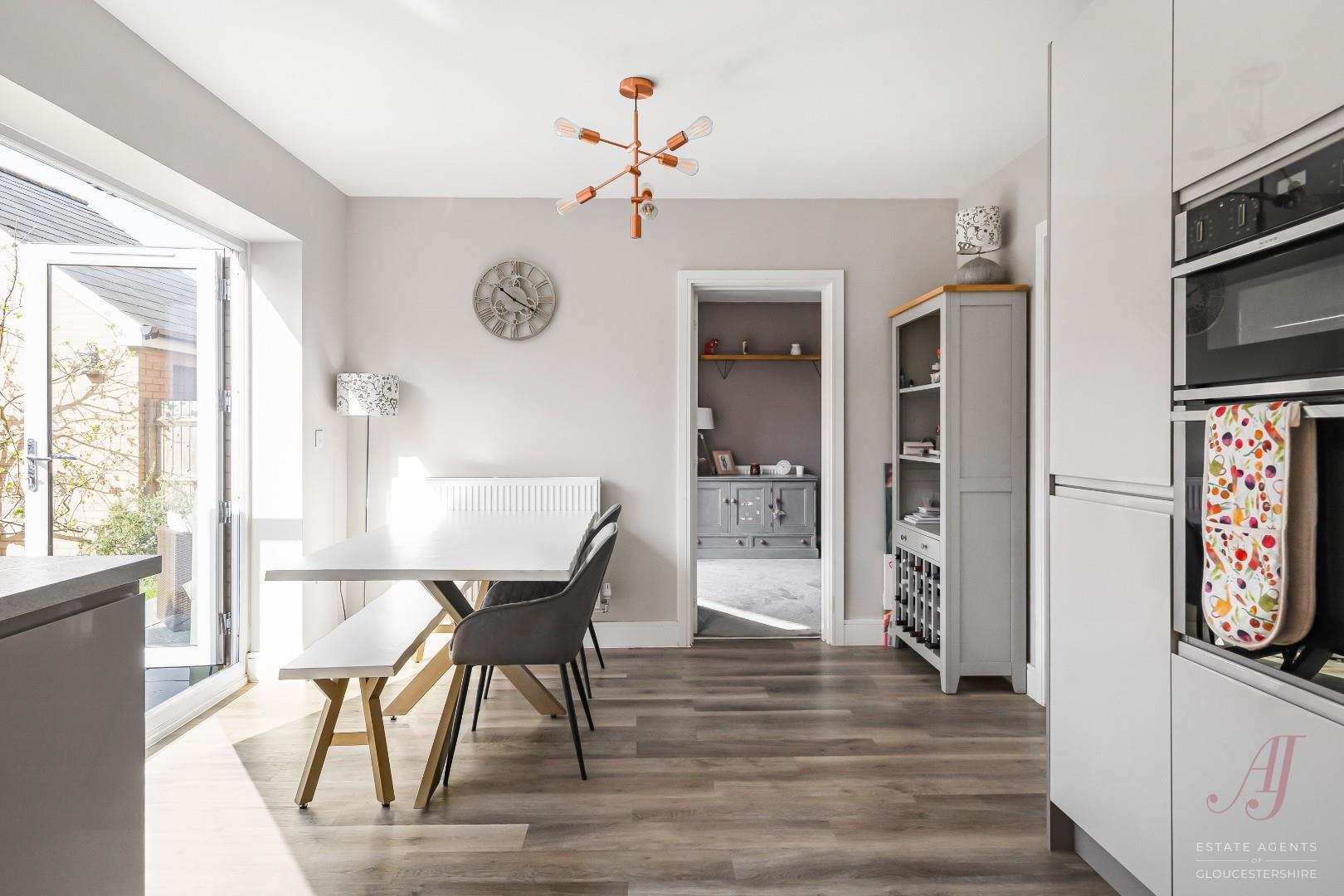 To the rear, the fitted dining kitchen forms the heart of the home. The space is well arranged with a range of modern wall and base units, complemented by work surfaces and integrated appliances including a fridge, dishwasher, double oven, hob and extractor. There is ample room for a dining table, making it ideal for family life and entertaining. French doors open onto the garden, enhancing the natural flow between inside and out.