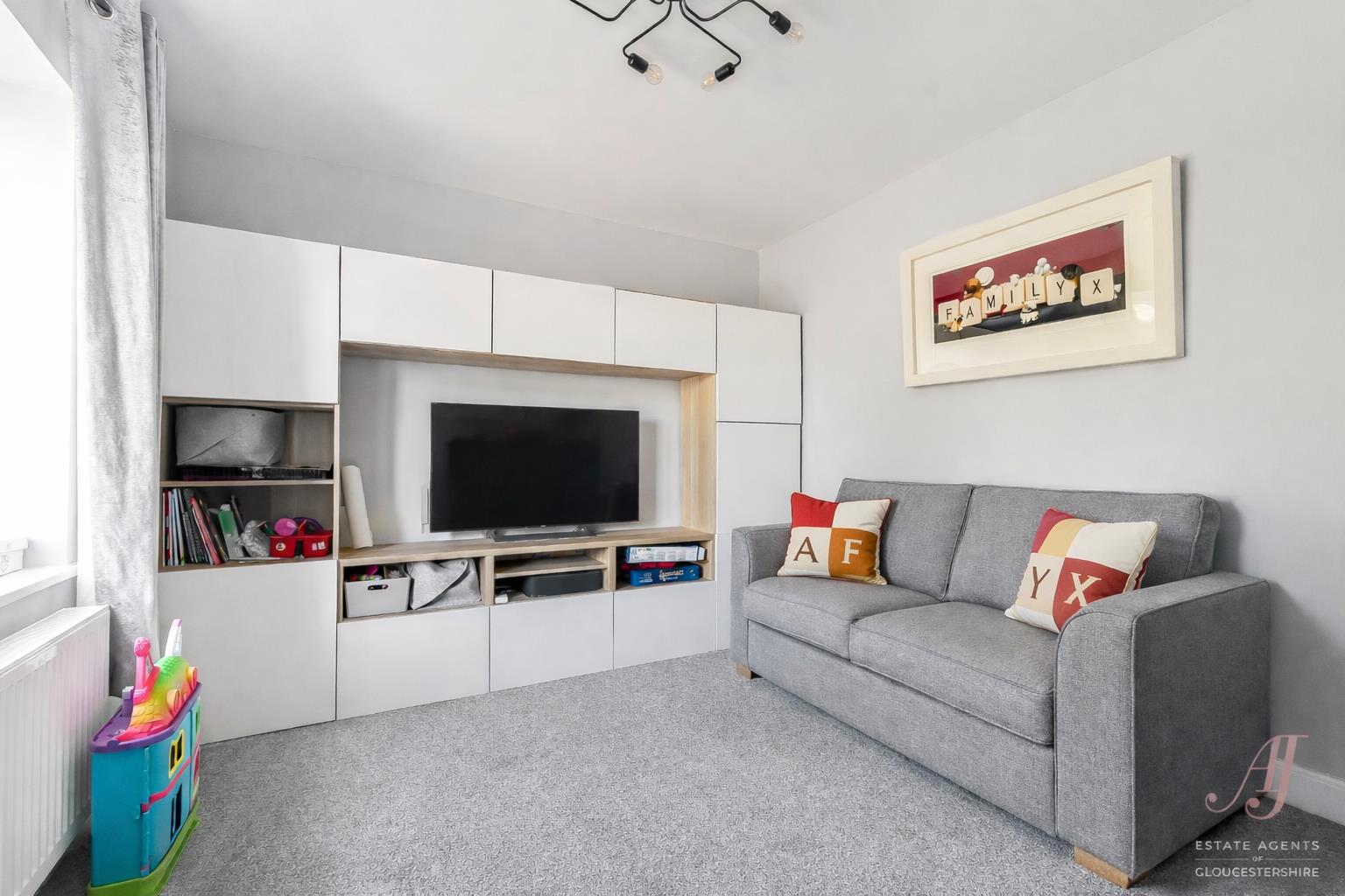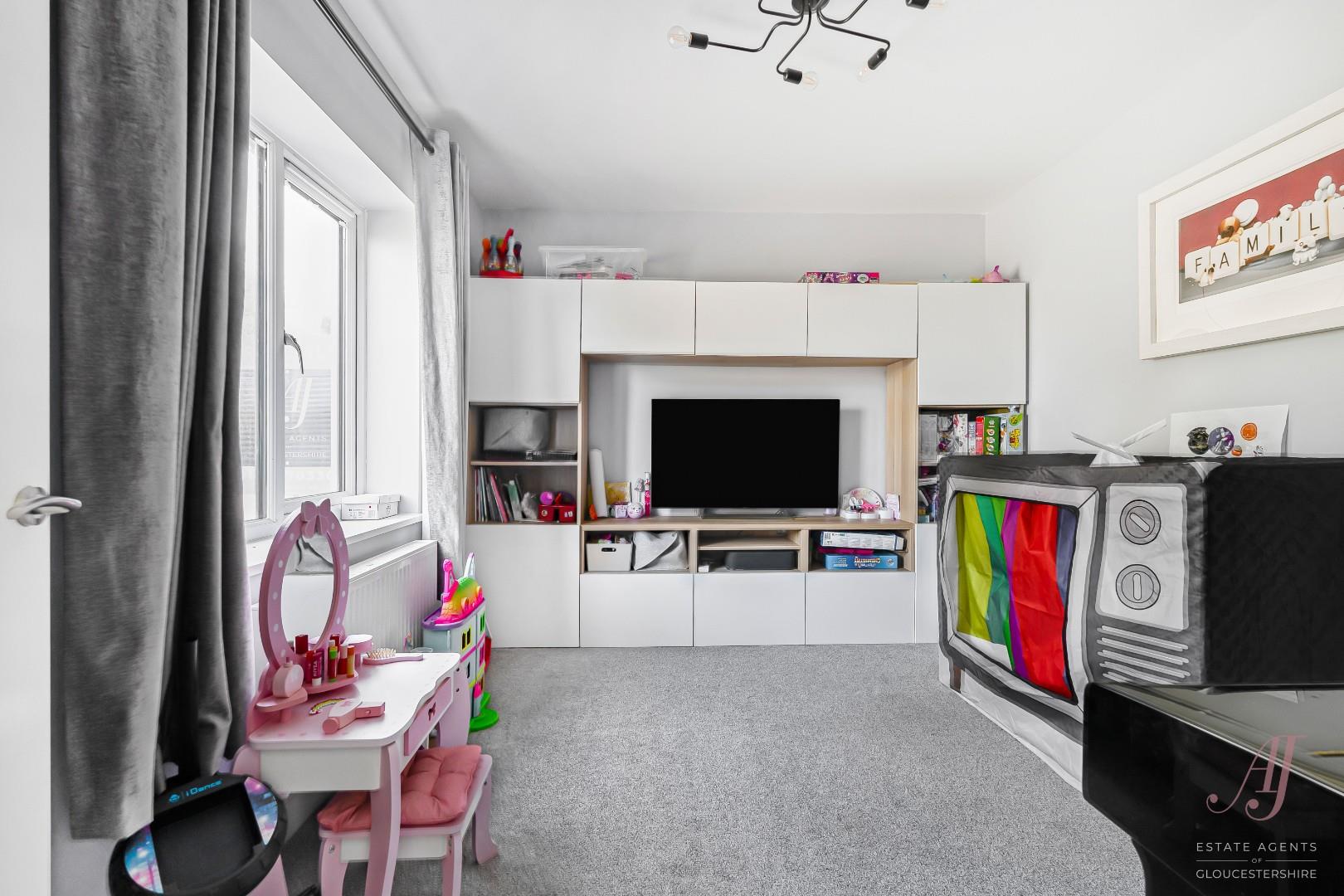 A second reception room, currently used as a playroom, offers excellent versatility. Positioned to the front, this room would work equally well as a snug, home office or additional reception space, depending on individual needs.