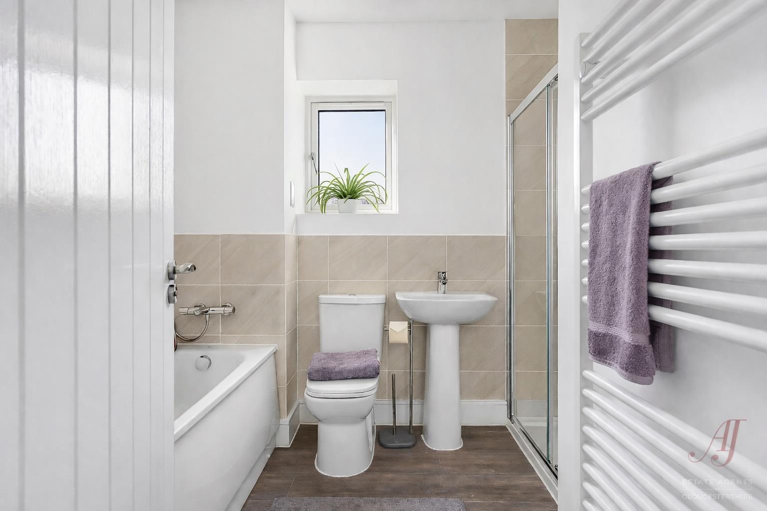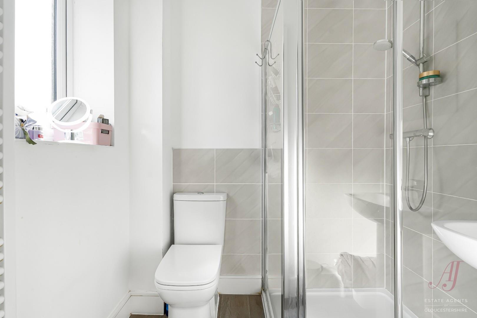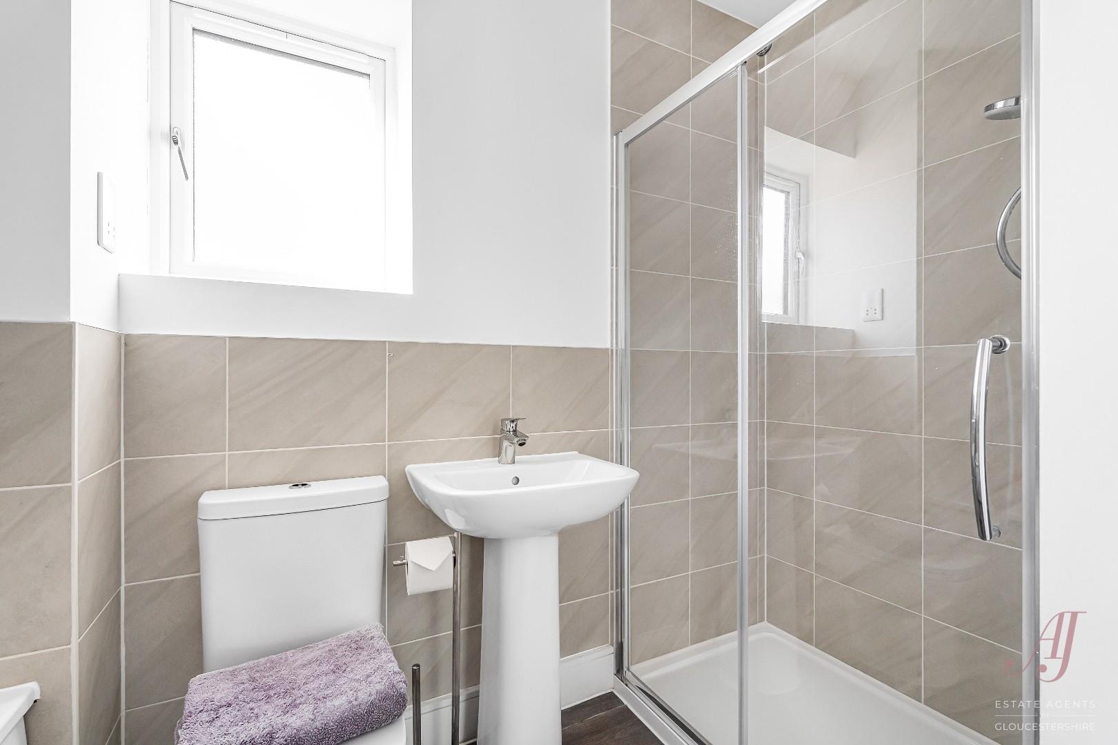 The family bathroom is fitted with a modern suite, including a bath with shower over, wash hand basin and WC, finished in a clean and practical style. An opaque window allows in a wealth of natural light while maintaining privacy.