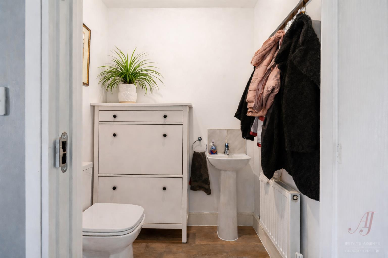 A front door opens into a welcoming entrance hall, creating a clean and simple first impression, with a downstairs cloakroom positioned off. The cloakroom is fitted with a WC and wash hand basin and also provides practical space for coats and shoes.
