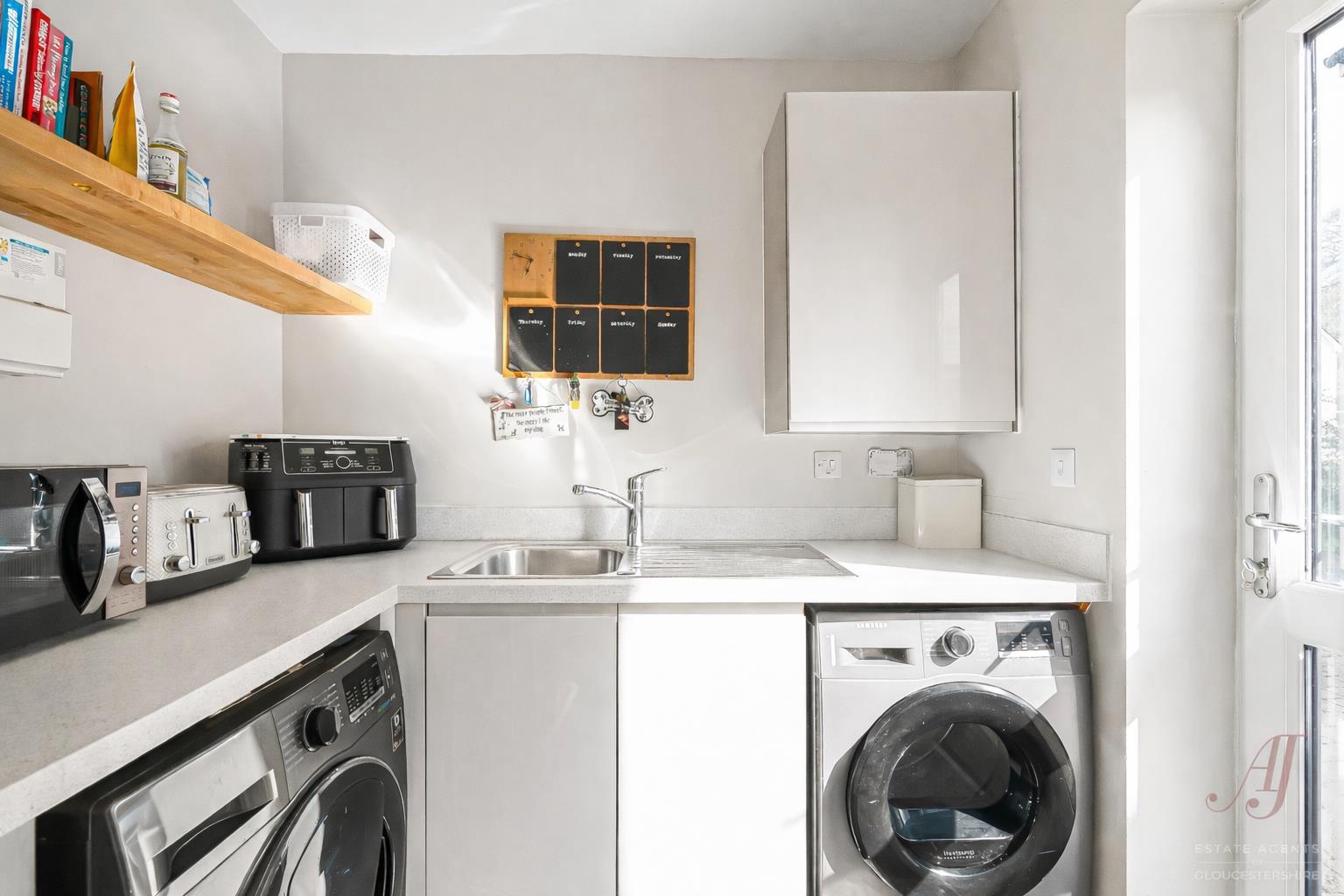 A separate utility room provides further practicality, with space for a washing machine and tumble dryer, additional storage, and a door leading out to the driveway. The boiler is neatly housed within a cupboard here.