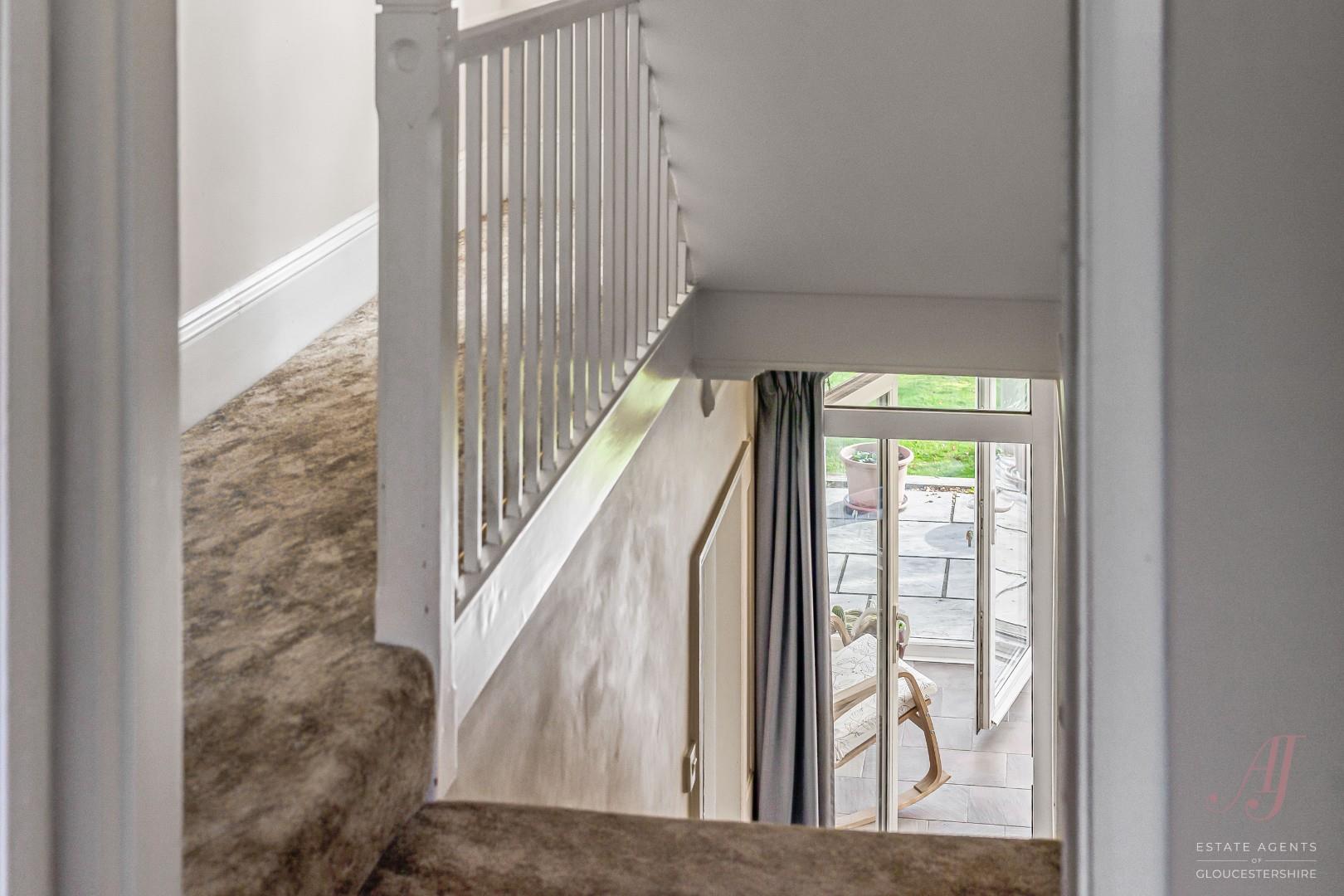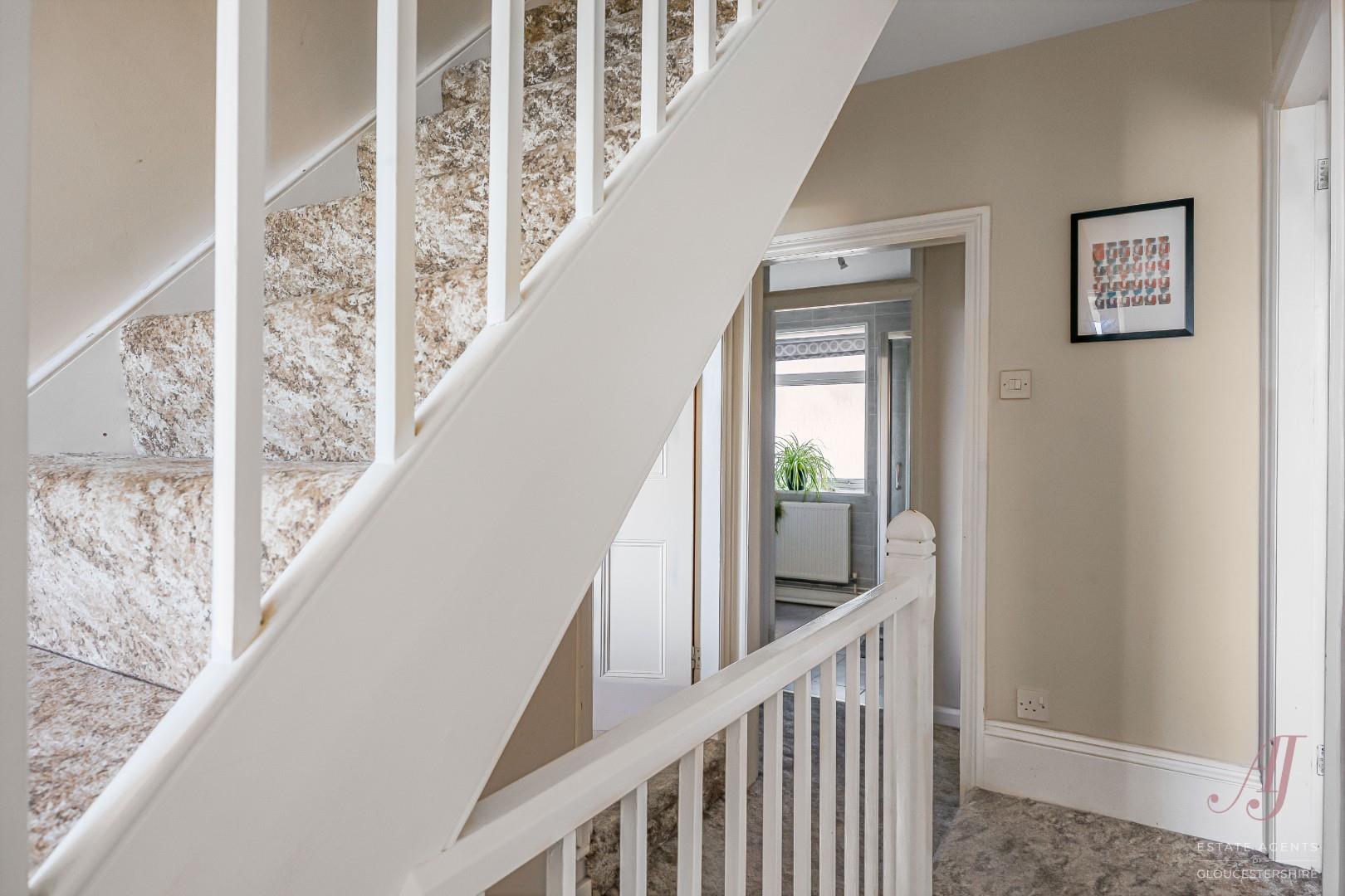 Stairs lead to a light landing, a window looks out to the garden with views across the valley to Rodborough, doors to three bedrooms and the family bathroom