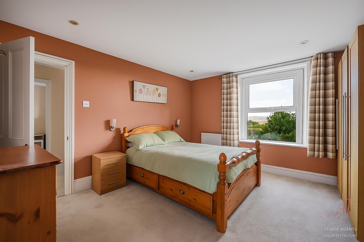 The master bedroom is a generous double with fitted wardrobes and drawers along one wall, a large window brings in strong natural light and frames an open view across the garden and across the valley The room has space at ease for a king size bed and additional furniture. Door leads to a larger than average en suite which includes a freestanding shower enclosure, pedestal basin, WC and a frosted side window. Tiled walls and flooring make the room practical to clean.