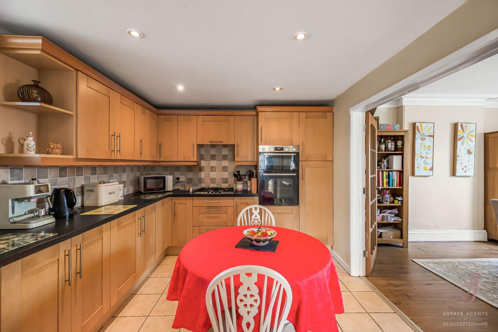 Fitted breakfast kitchen sits at the rear of the house with light wood floor and wall units along two walls offering a wealth of storage and work surface. Integrated appliances include double electric oven, gas hob, extractor and dishwasher with space for additional freestanding appliances. A window above the sink brings in daylight and open shelving offers extra display space. There is space at ease for a dining table and six chairs, tiled flooring throughout.