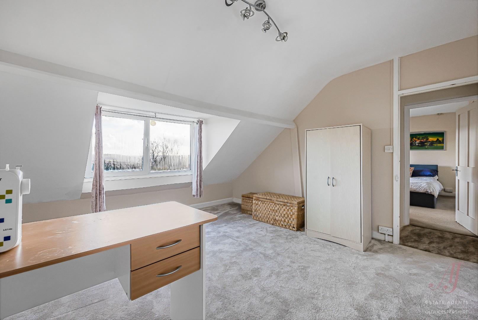 Bedroom four is a good size double, the dormer window offers views over the front garden and across the valley and surrounding countryside. There is plenty of floor space for a bed and freestanding furniture. Bedroom five also sits at the front of the house and has a dormer window that brings in strong natural light along with long views across the gardens, rooftops and hills. The room works well as a double bedroom, office or hobby room. Both rooms enjoy some of the best views in the house. A door leads to a useful eaves storage area. OFFERED TO THE MARKET WITH NO ONWARD CHAIN.