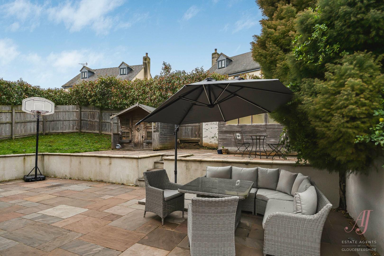 The rear garden is arranged across a series of well defined levels, creating a practical and versatile outdoor space. Directly behind the house, a paved terrace provides an ideal spot for outdoor seating and dining. This area feels private and sheltered, with space for a table, seating, and a barbecue, making it well suited to everyday use and entertaining.