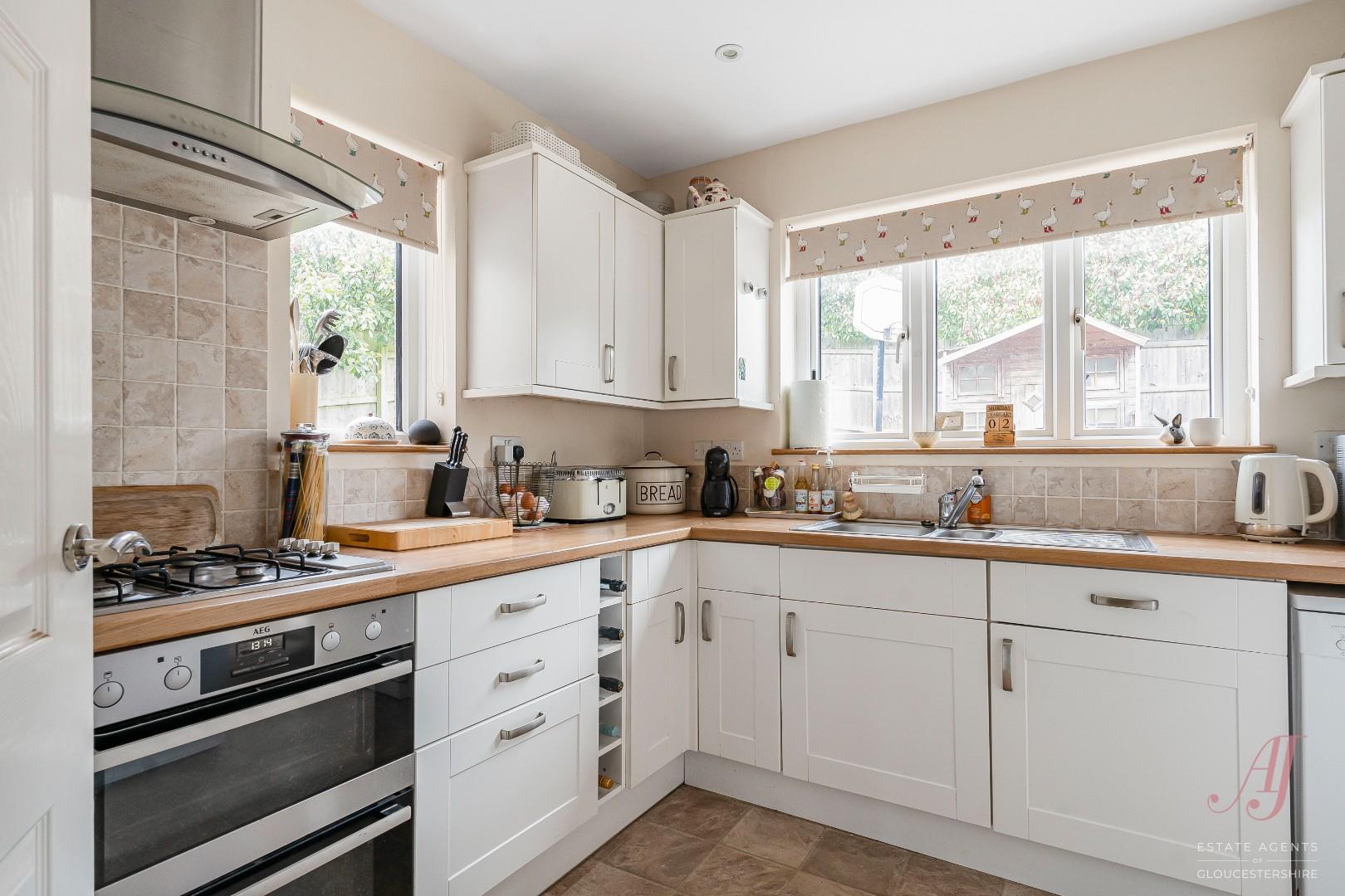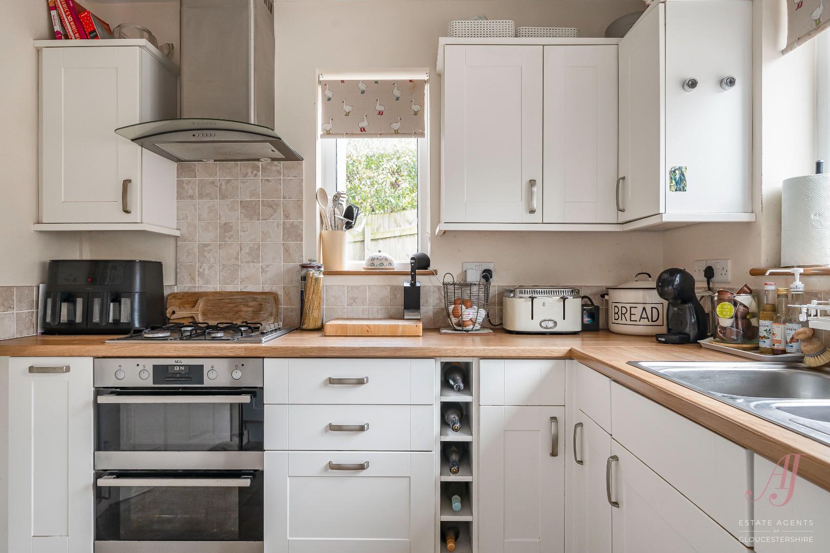 To the rear, is the fitted kitchen with floor and wall mounted cabinet in white, complimented by wood effect worktops and tiled splashbacks. Integrated appliances include a dishwasher, double oven and gas hob with extractor above, along with space for additional appliances. A window above the sink looks out to the garden and allows plenty of natural light into the room.