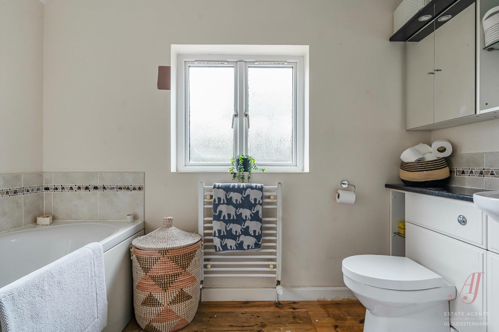 The four piece family bathroom is fitted with a bath, separate shower enclosure, wash hand basin, and WC. Tiled throughout and a window to the rear providing natural light and ventilation. Built in storage keeps the space practical and well arranged. the loft hatch is located in this room.