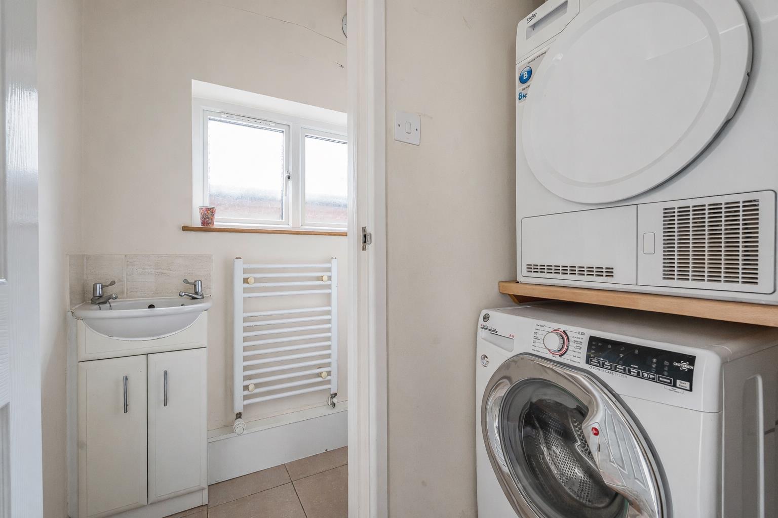 Off the kitchen, the utility area offers valuable additional space with room and plumbing for laundry appliances, along with worktop space and storage. A window provides light and ventilation, keeping the area practical and well organised. A ground floor cloakroom sits nearby and is fitted with a WC and wash hand basin, making it ideal for guests and day to day family use.