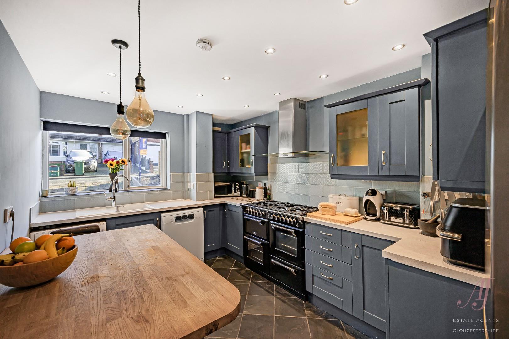 - Fitted kitchen with deep blue units, range cooker and breakfast island