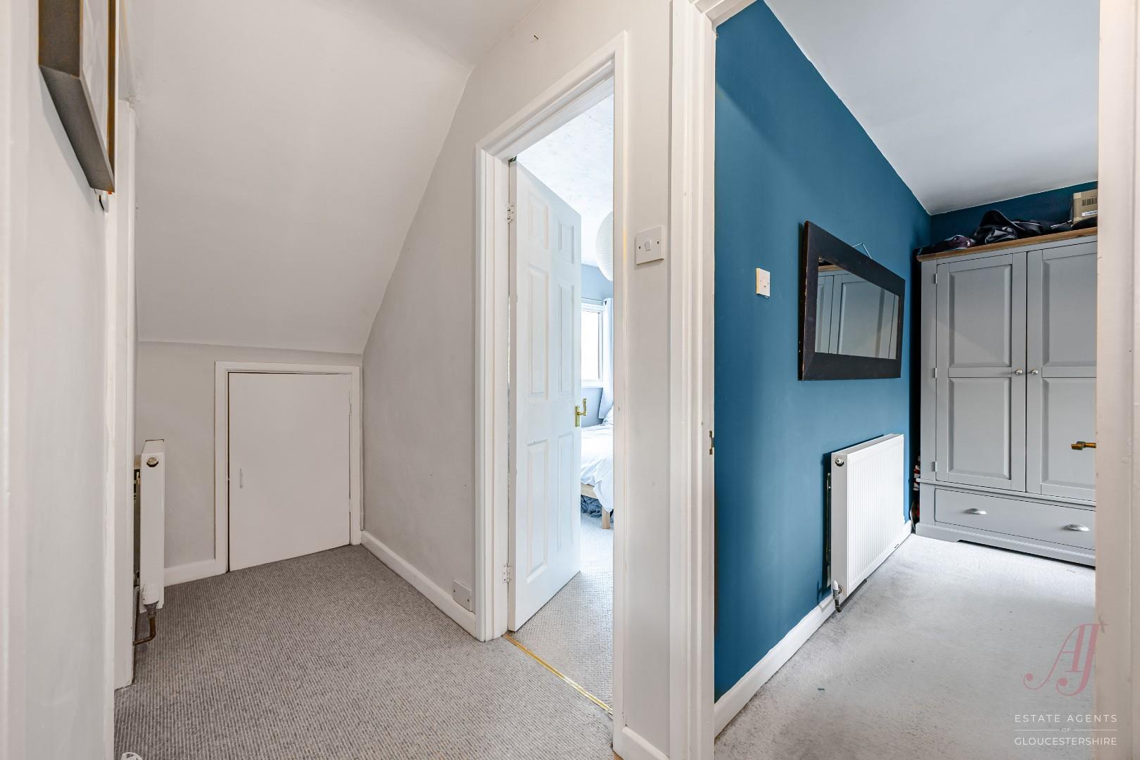 Stairs lead to the first floor landing with doors to all three bedrooms, eaves storage and the family bathroom. Door provides access to the eaves storage that stretches from the landing to behind the bathroom.