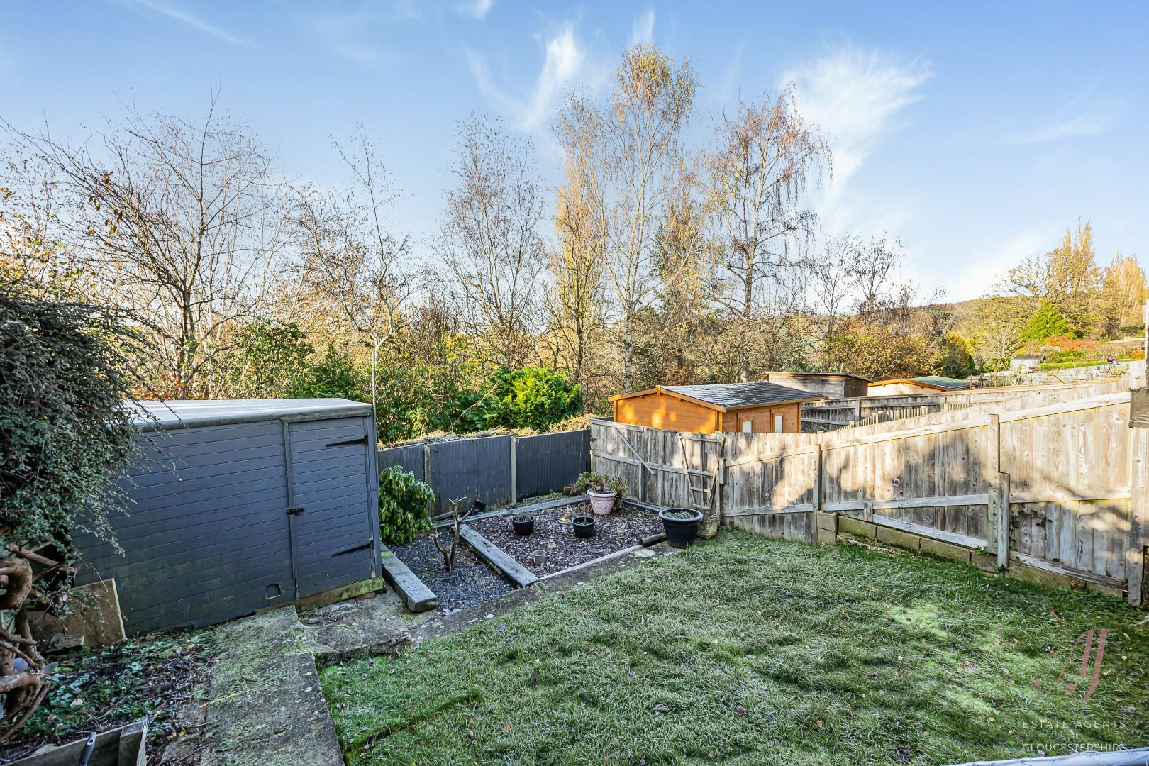 A garden shed provides useful storage. Mature trees beyond the rear boundary give a natural backdrop and seasonal colour.