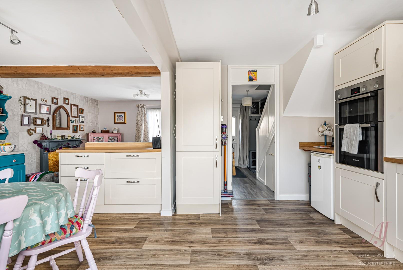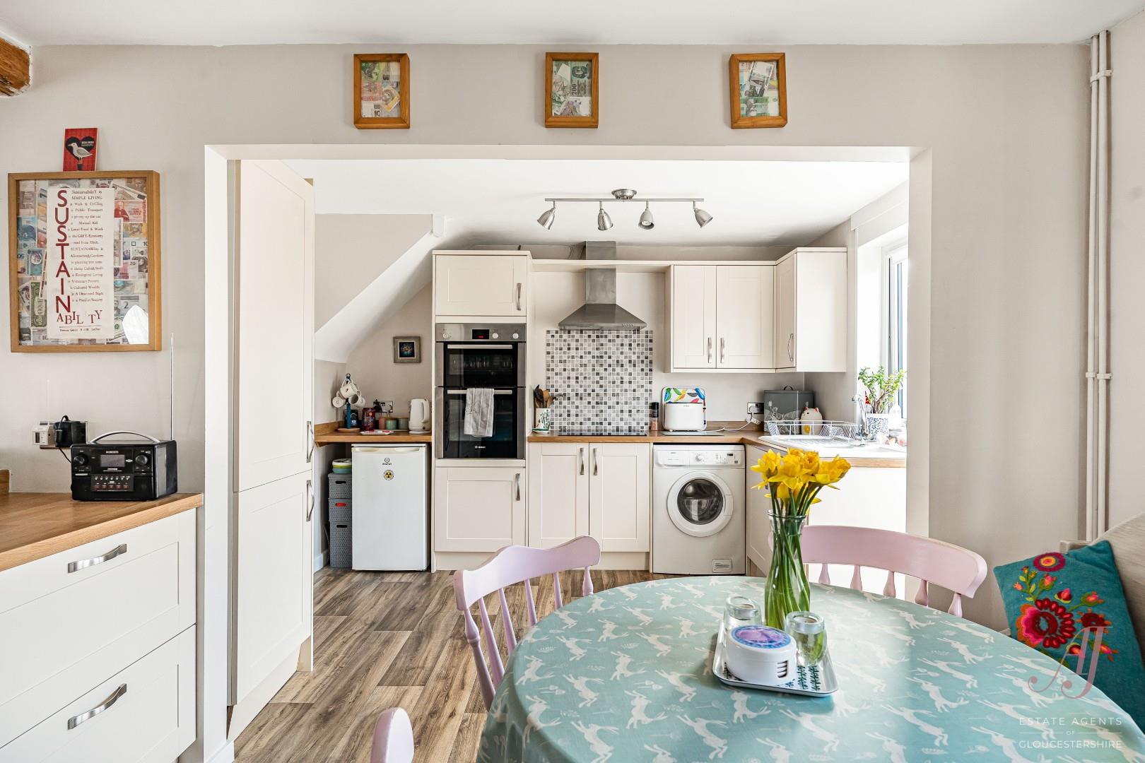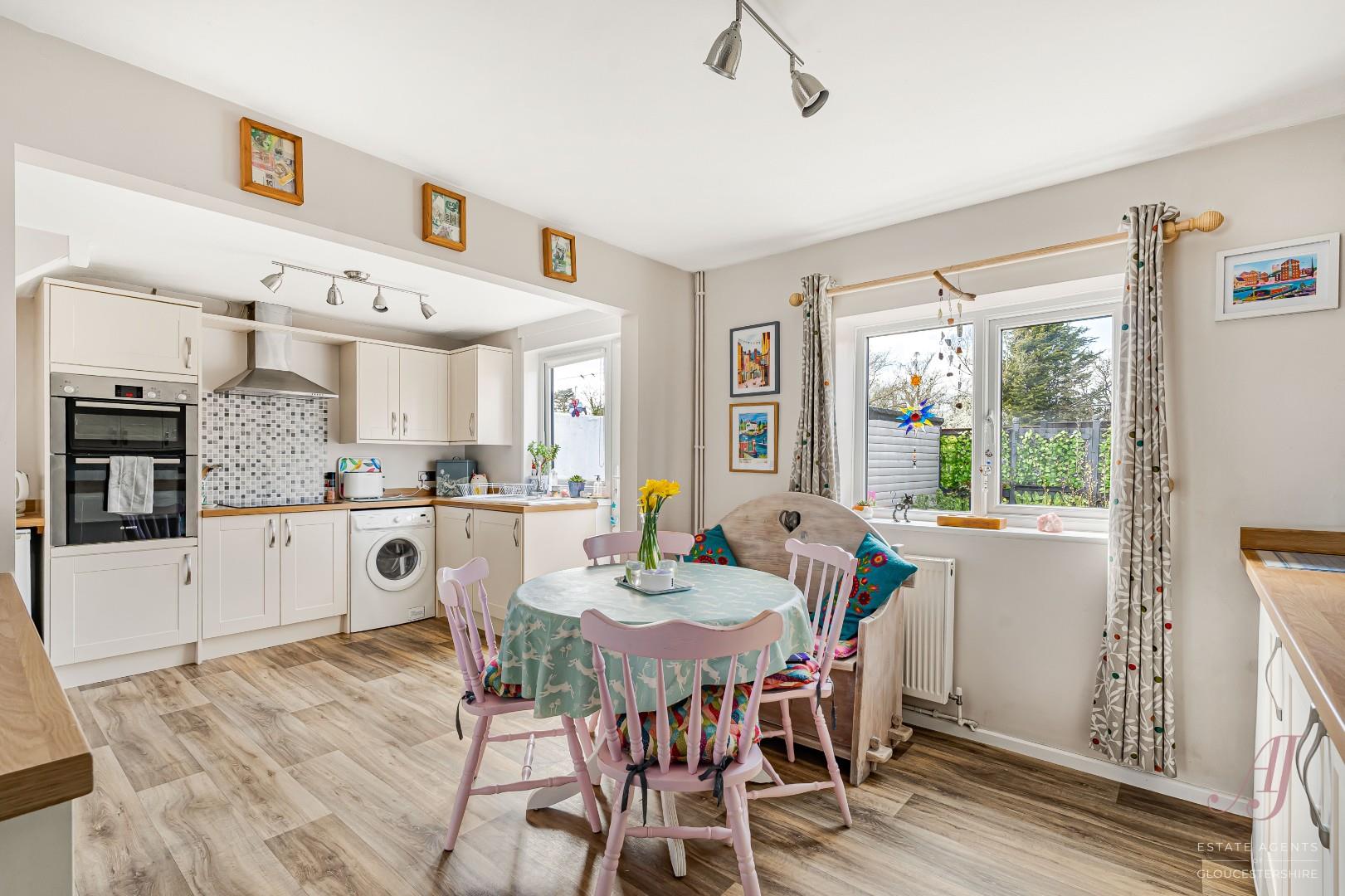 The fitted kitchen has a range of cream base and wall units, complemented by wood effect work surfaces, providing ample preparation and storage space. Integrated appliances include a double electric oven, hob and extractor, with further space for additional appliances. The dining area sits comfortably alongside, making it ideal for both everyday use and entertaining. A door from the kitchen provides direct access to the enclosed garden at the rear.