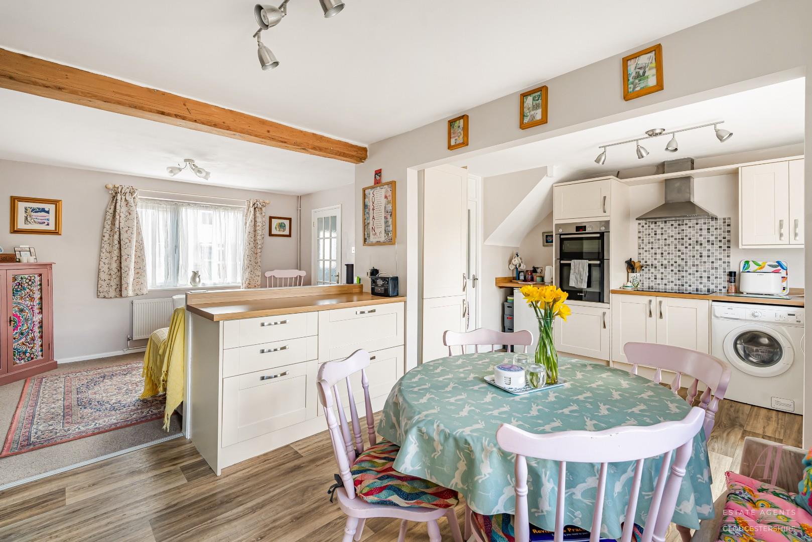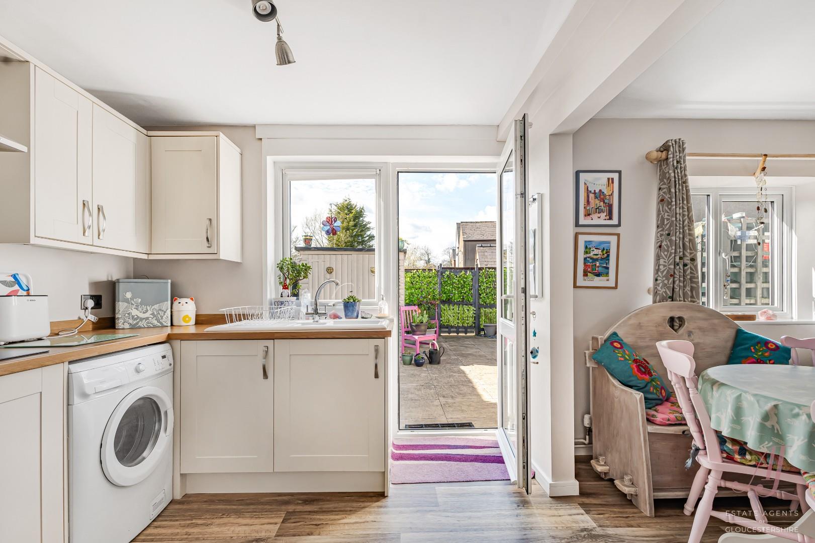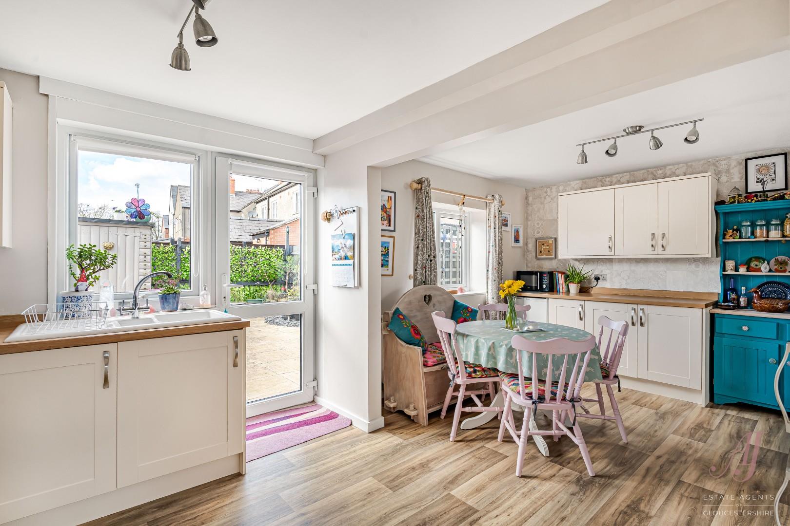 The fitted kitchen has a range of cream base and wall units, complemented by wood effect work surfaces, providing ample preparation and storage space. Integrated appliances include a double electric oven, hob and extractor, with further space for additional appliances. The dining area sits comfortably alongside, making it ideal for both everyday use and entertaining. A door from the kitchen provides direct access to the enclosed garden at the rear.