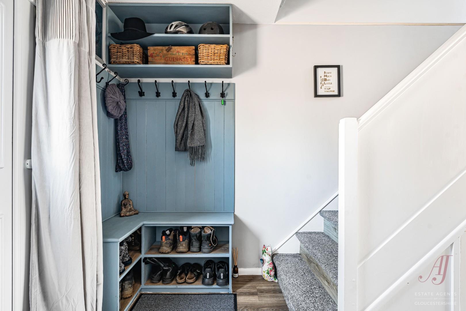 Stepping inside, the entrance hall provides a practical and welcoming space, complete with a fitted cloaks area for coats and boots. There is useful understairs storage, ideal for everyday items, with doors leading through to the main living areas and stairs rising to the first floor.