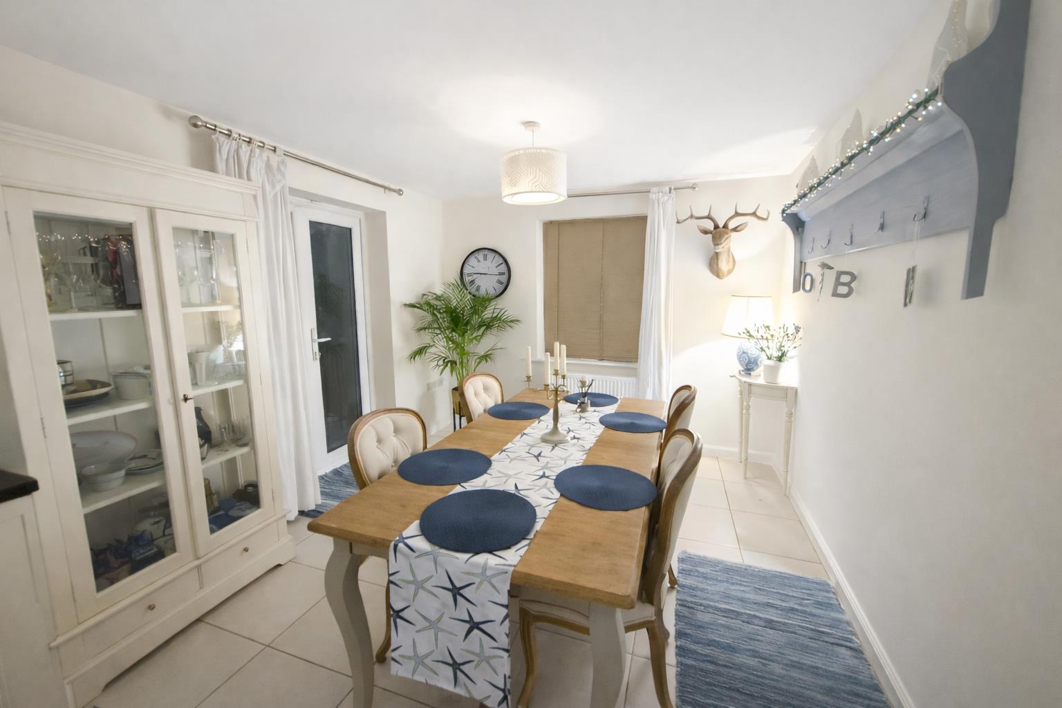 A superb fitted dining kitchen forms the heart of the home and spans the full depth of the property. The kitchen offers a range of base and wall mounted cabinets in a cream gloss finish with dark wood effect work surfaces. Built-in fridge/freezer, integrated dishwasher, Single electric oven, gas hob and extactor. A window enjoys a pleasant outlook to the garden, ideal for keeping an eye on children playing, with sink inset. A door leads through to the utility room with space for a washing machine and tumble dryer. A cupboard houses the boiler, and a back door opens to the outside path which continues around to the garden. The dining area provides space at ease for an eight seater table and chairs, window to the side and French doors open directly onto the garden, creating an easy connection between inside and outside living suited to both everyday use and summer entertaining.