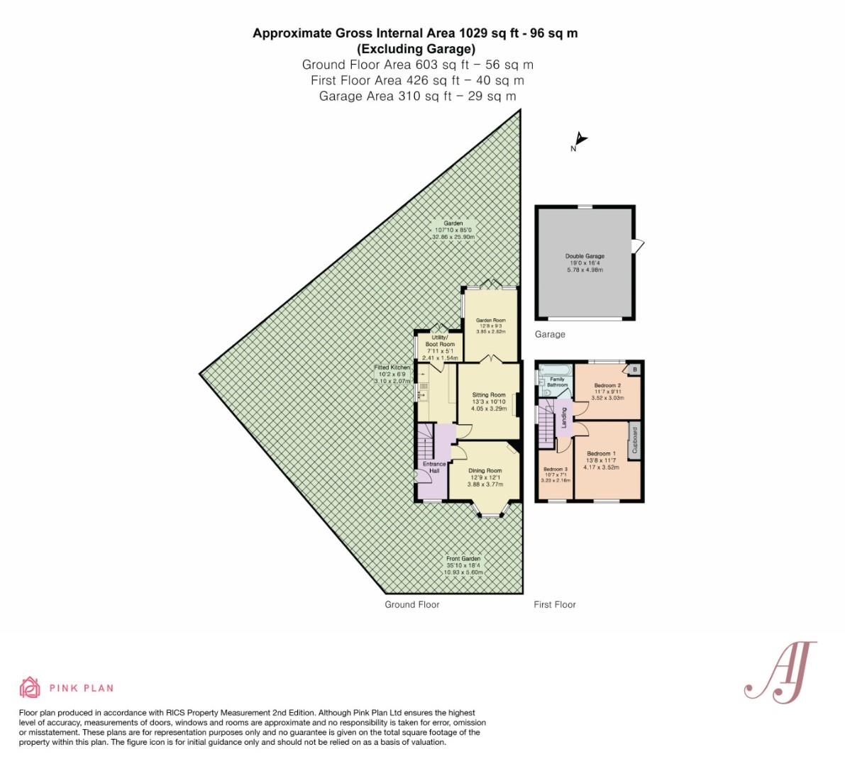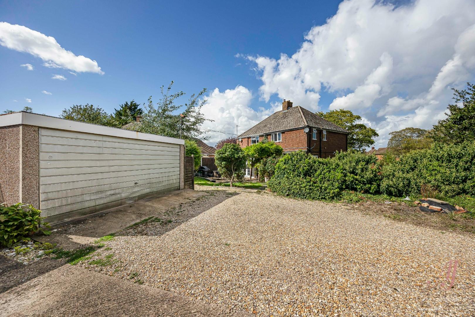 Pedestrian access to the front leads across a lawned approach and pathway to the side entrance, while a private driveway at the rear provides ample parking and access to a detached double garage.