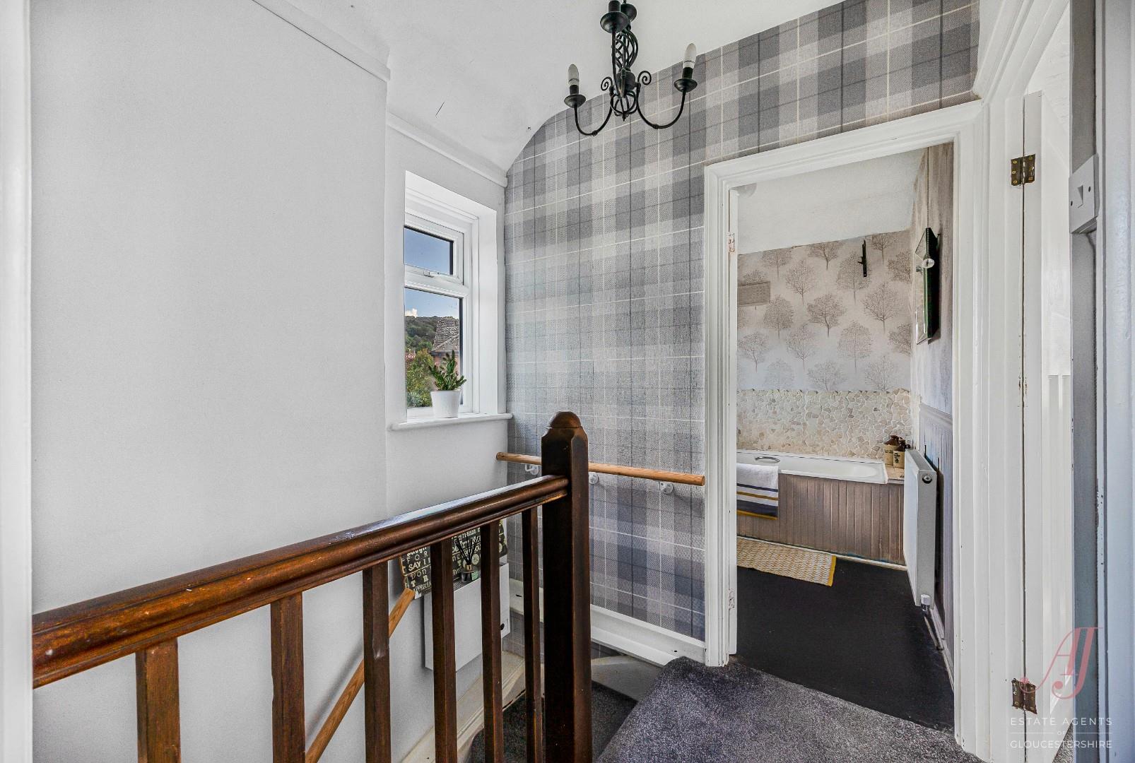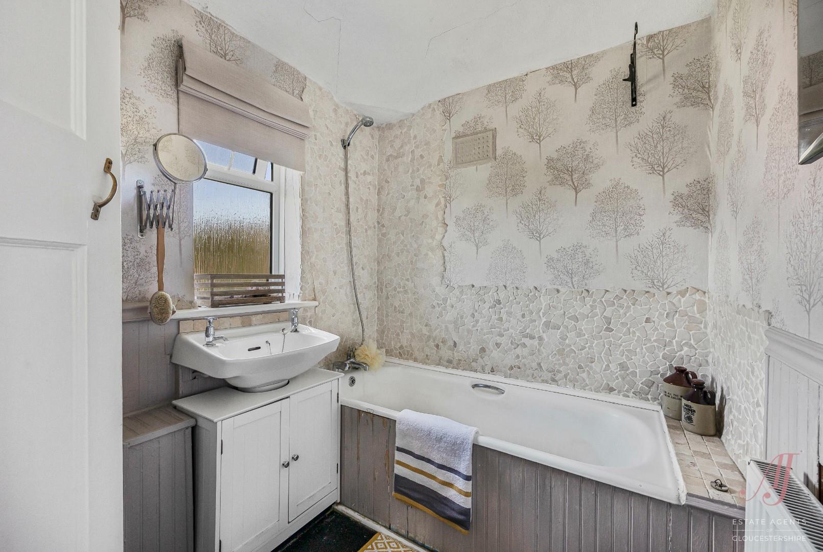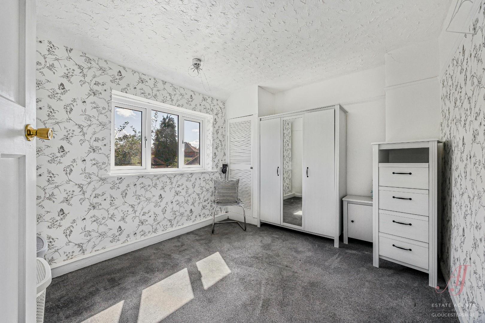 Stairs rises to the first floor to a bright landing with a window to the side, loft access, and doors to all rooms. Two double bedrooms provide excellent accommodation, with the front bedroom benefiting from a wide bay window and a built-in cupboard, while the rear bedroom enjoys distant views to Robinswood Hill, a built-in cupboard houses the combination boiler, believed to be around six years old. A third single bedroom to the front with space for a wardrobe and a single bed at ease. The family bathroom is fitted with a bath and shower over, a low flush WC, and a handwash basin with storage beneath, while a frosted window ensures both light and privacy.