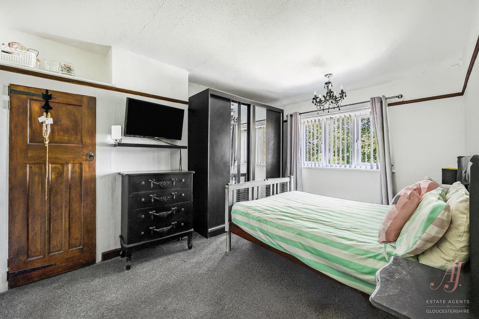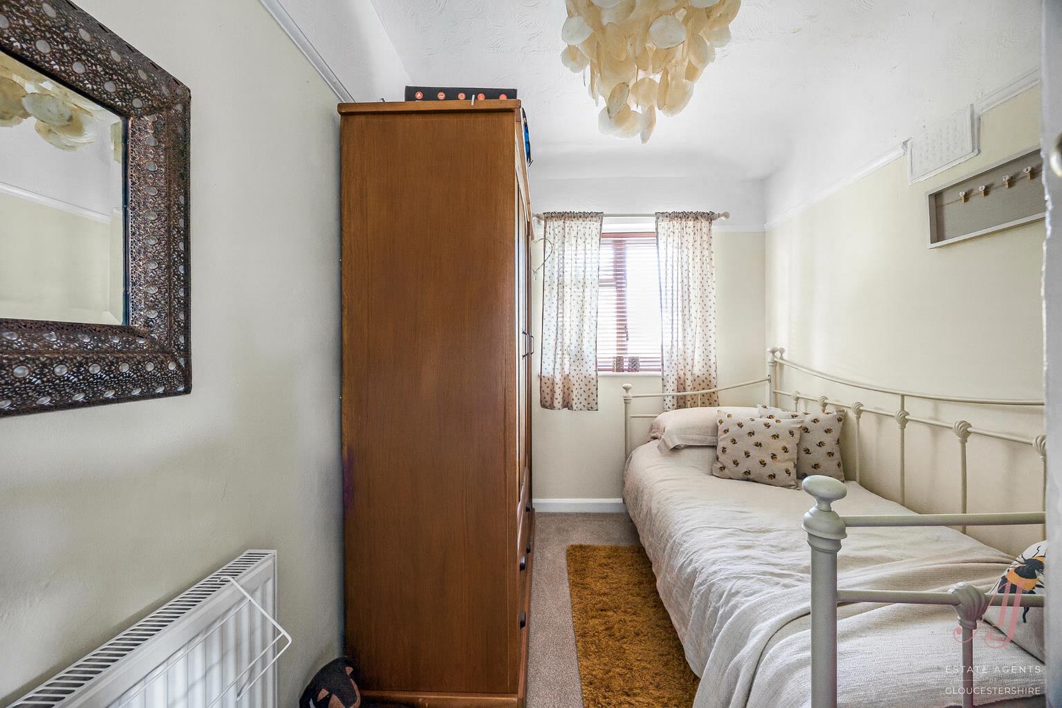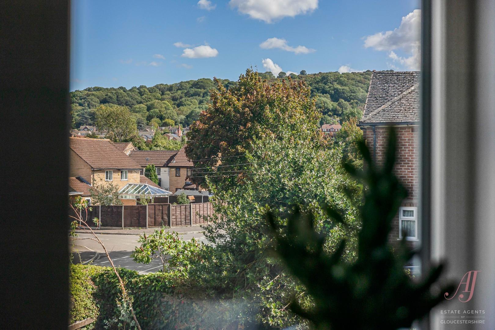 Stairs rises to the first floor to a bright landing with a window to the side, loft access, and doors to all rooms. Two double bedrooms provide excellent accommodation, with the front bedroom benefiting from a wide bay window and a built-in cupboard, while the rear bedroom enjoys distant views to Robinswood Hill, a built-in cupboard houses the combination boiler, believed to be around six years old. A third single bedroom to the front with space for a wardrobe and a single bed at ease. The family bathroom is fitted with a bath and shower over, a low flush WC, and a handwash basin with storage beneath, while a frosted window ensures both light and privacy.