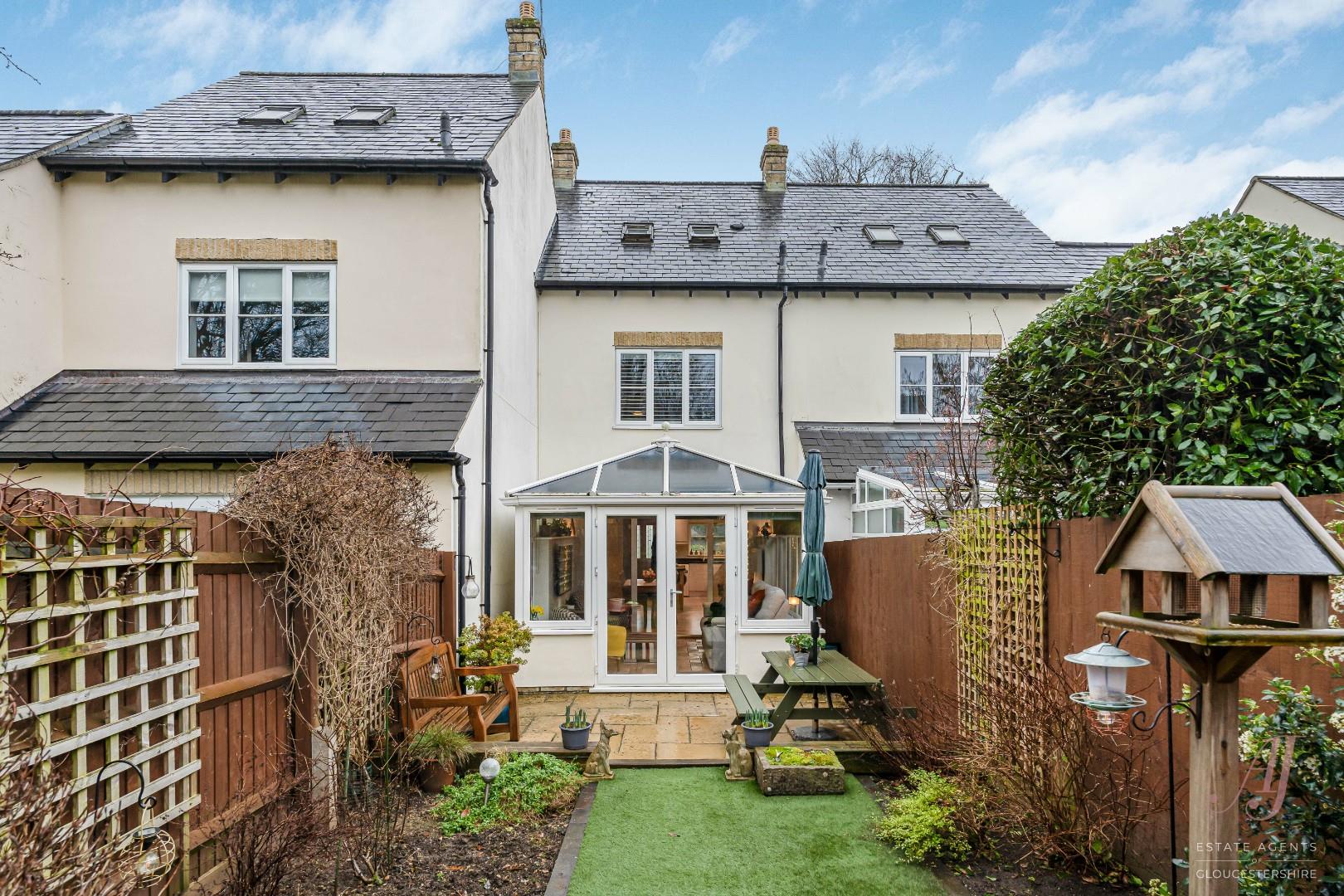 VIEWERS MUST BE IN A POSITION TO PROCEED. A well presented three bedroom, three storey townhouse set within a private road and small enclave of homes in the popular Parkend area of Stroud. The property enjoys an attractive outlook across a private communal green and offers well planned, modern accommodation arranged over three levels. The ground floor has an entrance hall with space fro coats, door opens to a handy downstairs cloakroom, with low flush WC and hand basin. The living space on the ground floor features an open plan fitted dining kitchen and sitting room, ideal for everyday living, with French doors opening into a bright garden room providing a versatile additional reception and direct access to the rear garden. On the first floor a double bedroom overlooking the garden, a further single bedroom suited to home working or guests, and a modern family bathroom. The top floor is devoted to the master bedroom suite, complete with dressing area and en suite shower room. Outside, the enclosed rear garden enjoys a westerly aspect and has been designed for low maintenance, with a paved terrace, artificial lawn and planted borders, along with gated rear access. The property also benefits from a single garage en bloc with power and lighting, parking, and a convenient location within easy reach of local shops, bus routes and Stroud town centre.