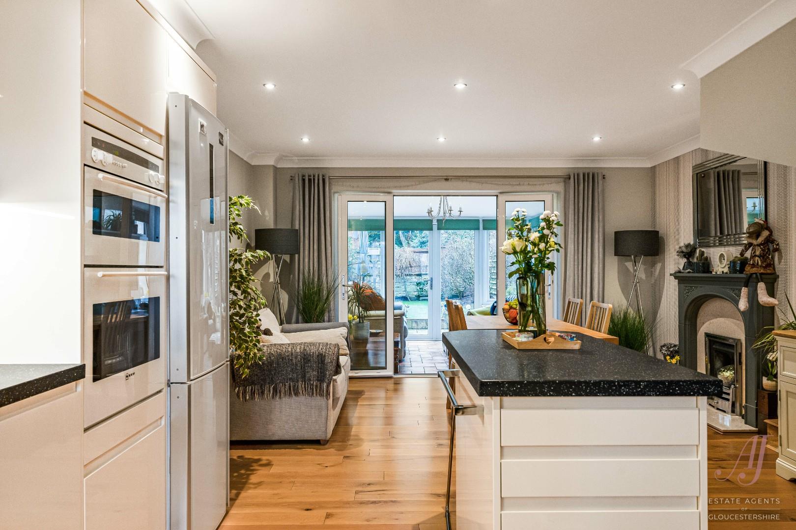 The outlook across the private communal green creates a sense of calm and space, a feature that sets the tone for what lies within. Inside, the accommodation has been thoughtfully arranged to suit modern living, with a standout open-plan kitchen, dining and family area forming the heart of the home; a space equally suited to everyday life and entertaining. This flows into a bright garden room, enhancing both the sense of light and the connection to the landscaped rear garden.