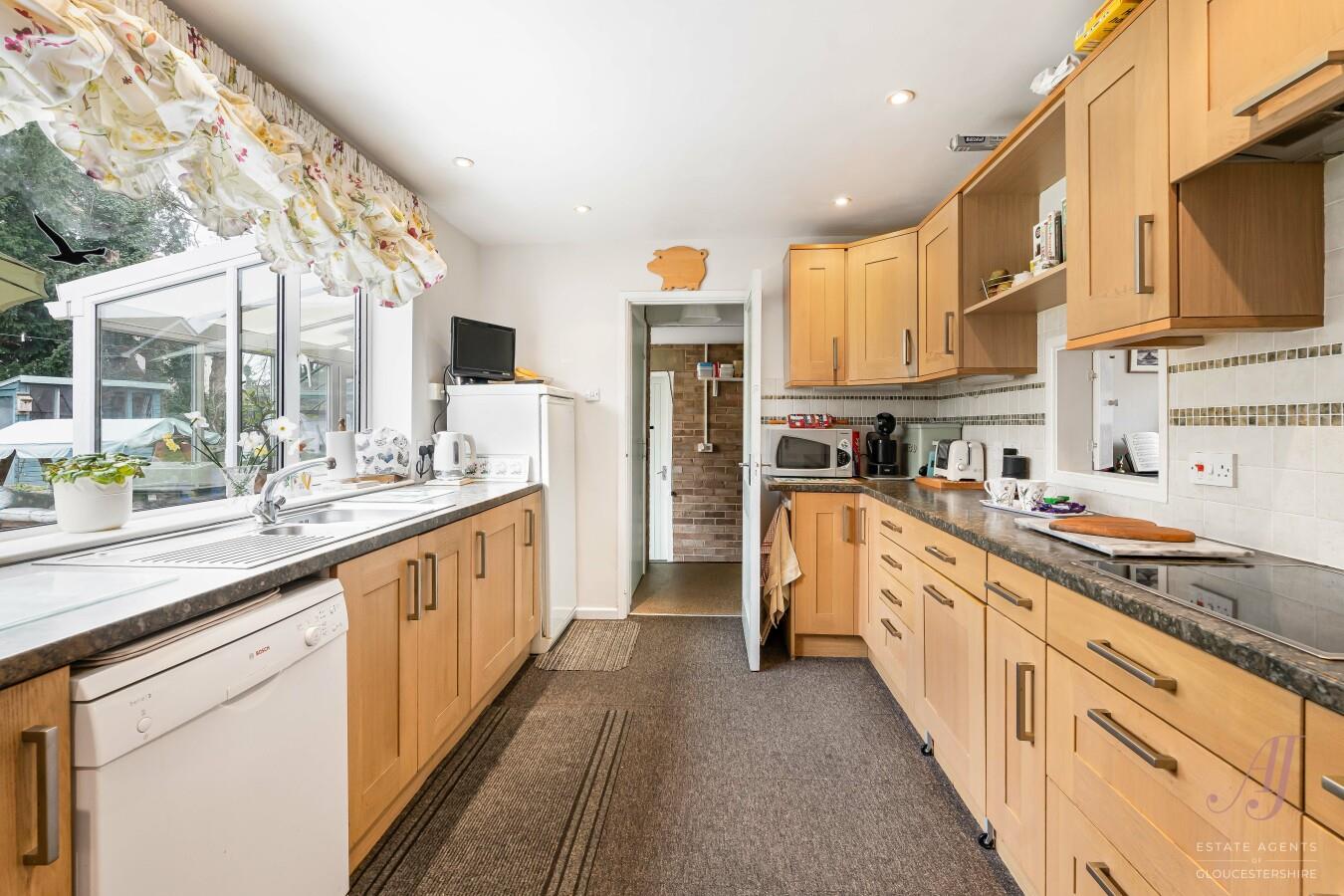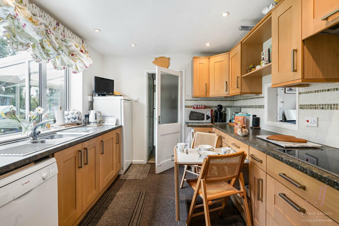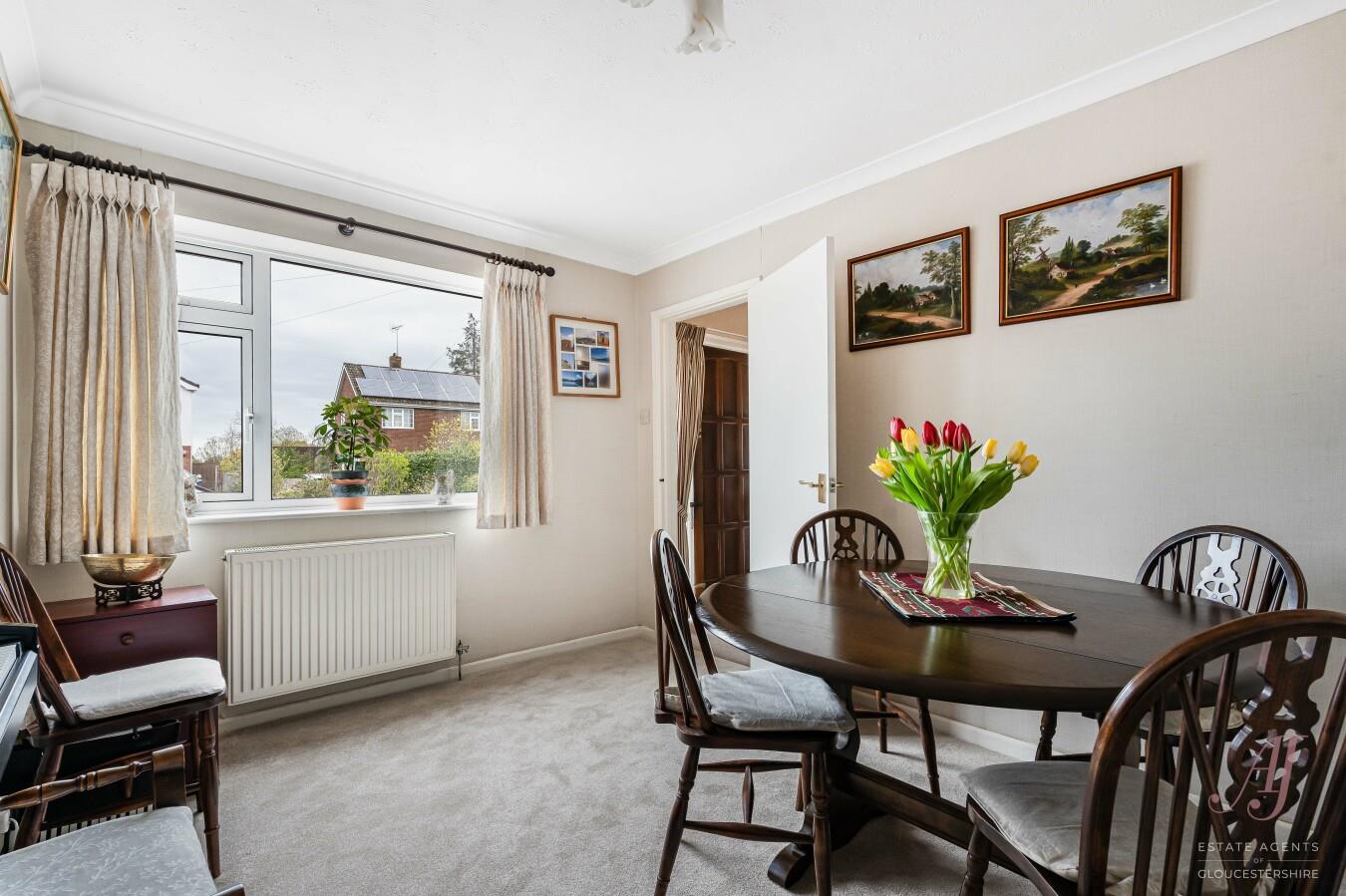 The dining room is positioned to the front of the property and is a versatile reception room with a window overlooking the drive and front garden. A hatch opens through to the fitted kitchen, creating a practical link between the two spaces. There is also potential, subject to any necessary consents and building regulations, to open this through further to create a larger family dining kitchen if desired.