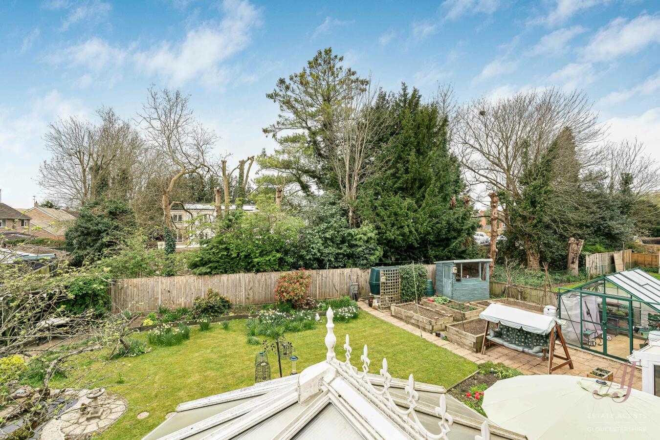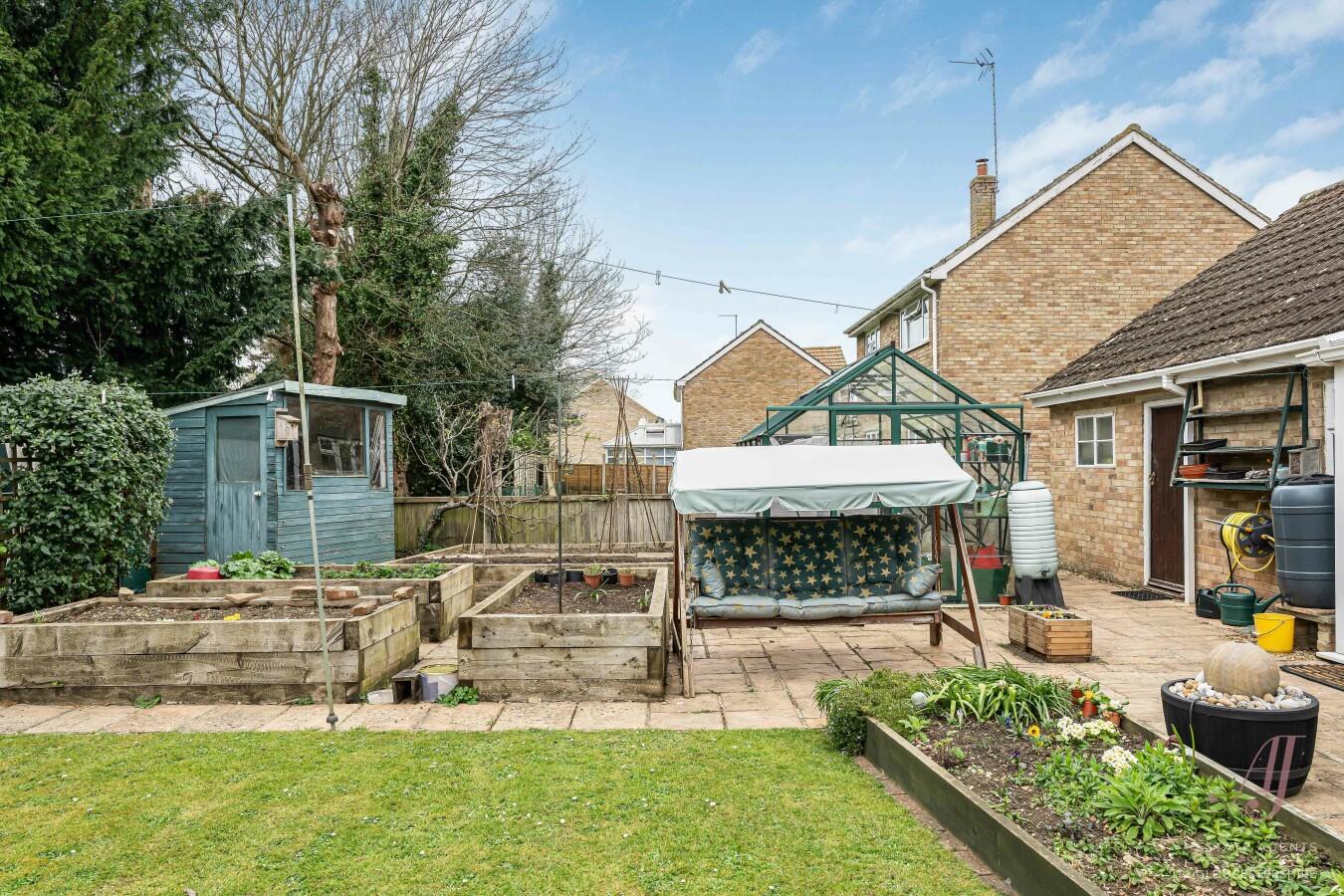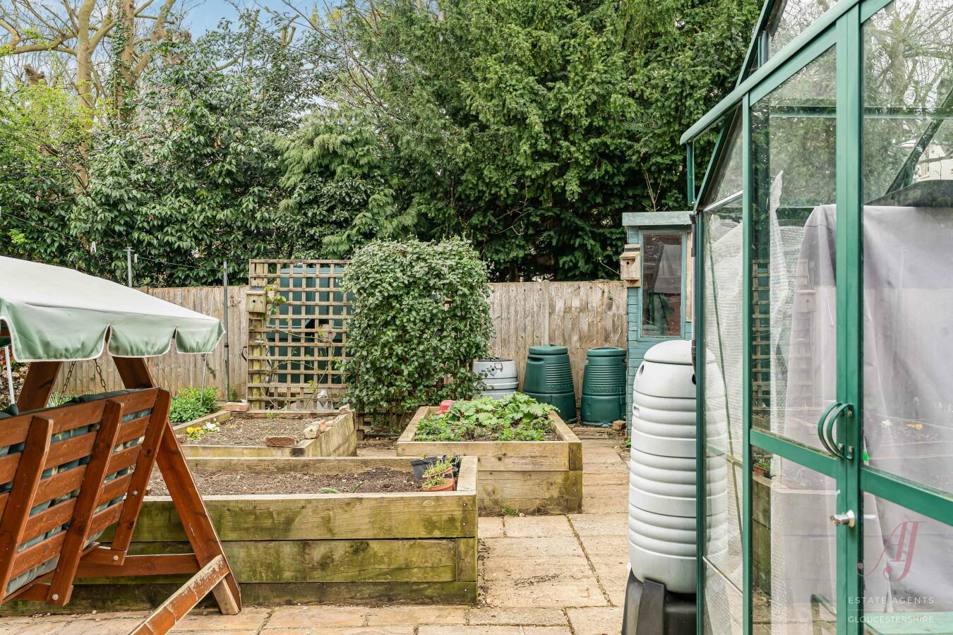 Towards the rear, there is a productive garden area with raised beds, ideal for those with an interest in growing vegetables or plants, complemented by a greenhouse which offers a practical space for year-round use. A garden shed provides additional storage, and a pergola creates a lovely spot to sit and enjoy the surroundings.