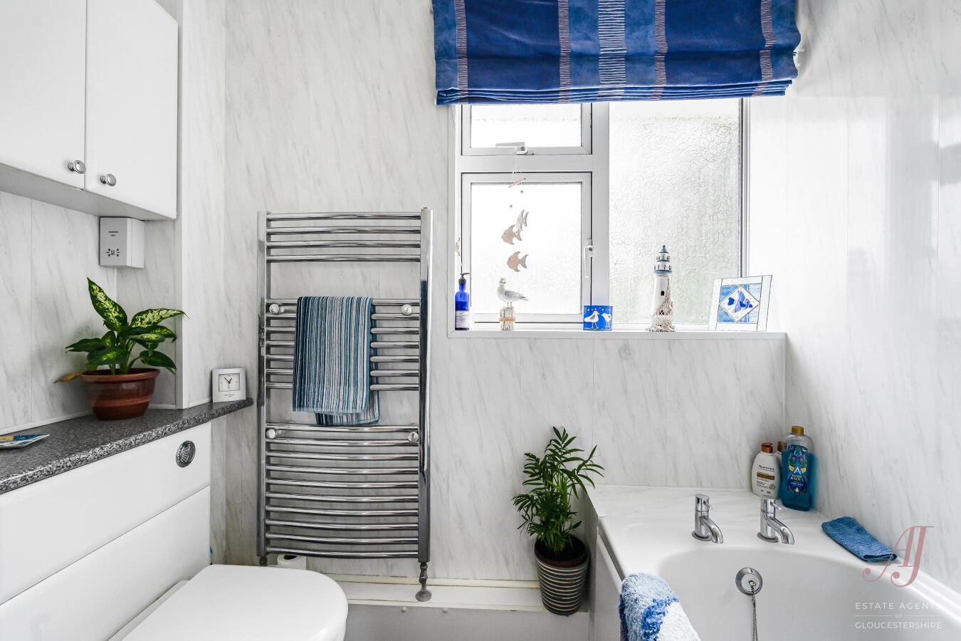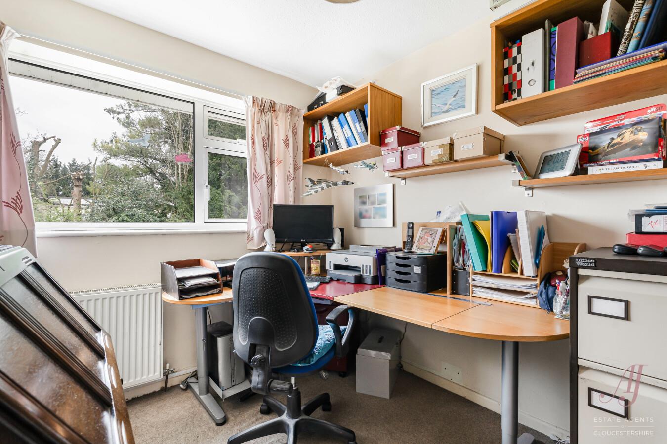 Bedroom two sits to the rear and enjoys views over the garden, creating a peaceful double room. Bedroom three is a well proportioned double positioned to the front, with a window drawing in plenty of natural light and offering a pleasant outlook. Bedroom four is also to the rear and is currently used as a study, with views over the garden. This is a flexible space, well suited to a home office, child’s bedroom or guest room. The accommodation is completed by a family bathroom fitted with a white suite including a bath with shower over, wash hand basin and WC. An opaque window allows in a wealth of natural light while maintaining privacy, and a heated towel rail adds further comfort.