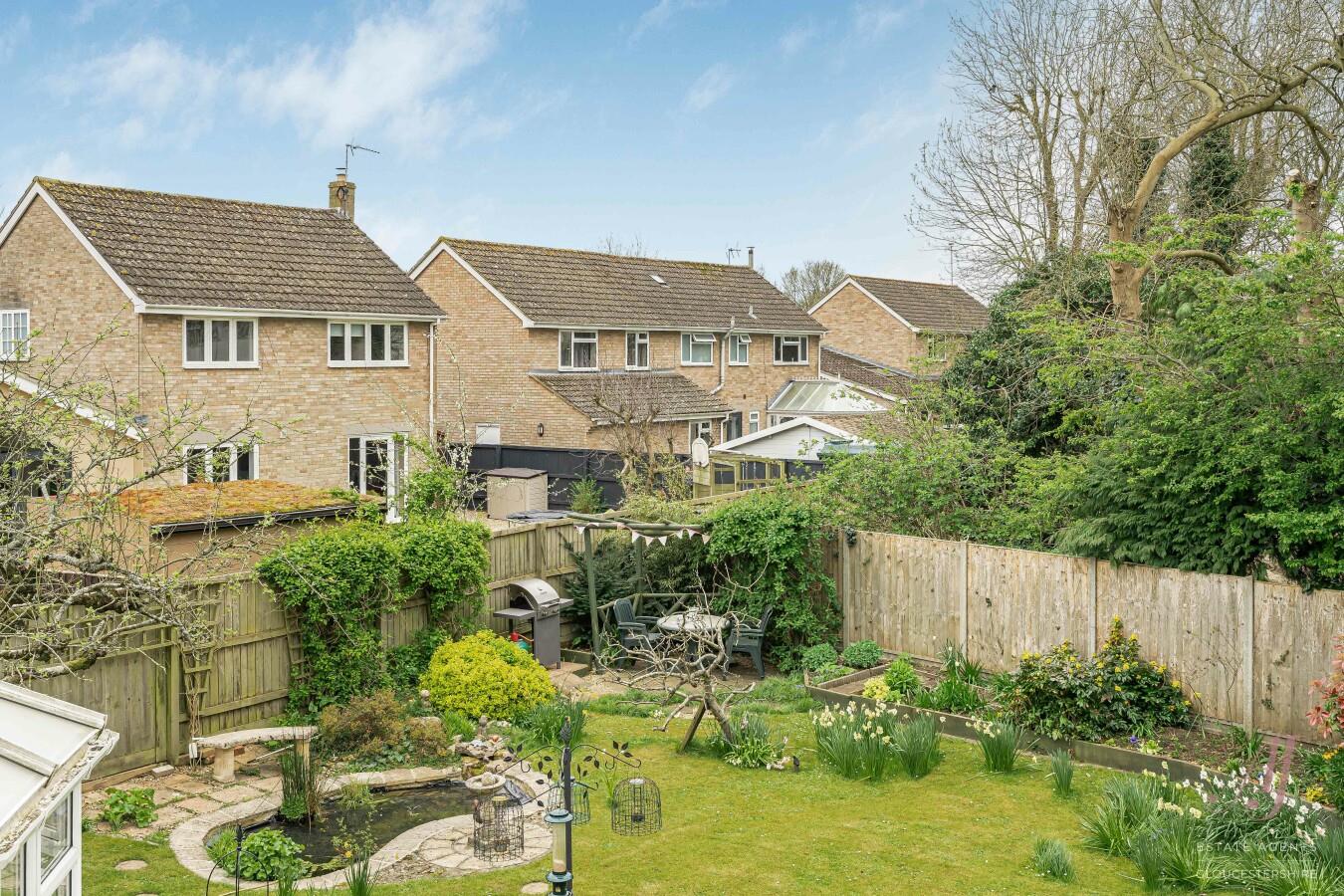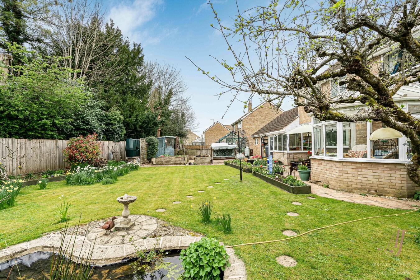 A large central lawn provides an excellent area for families, with plenty of space for children to play, while well-stocked borders surround the garden, filled with a wide variety of planting that brings colour and interest throughout the seasons. A charming ornamental pond creates an attractive focal point, adding character and a peaceful setting.