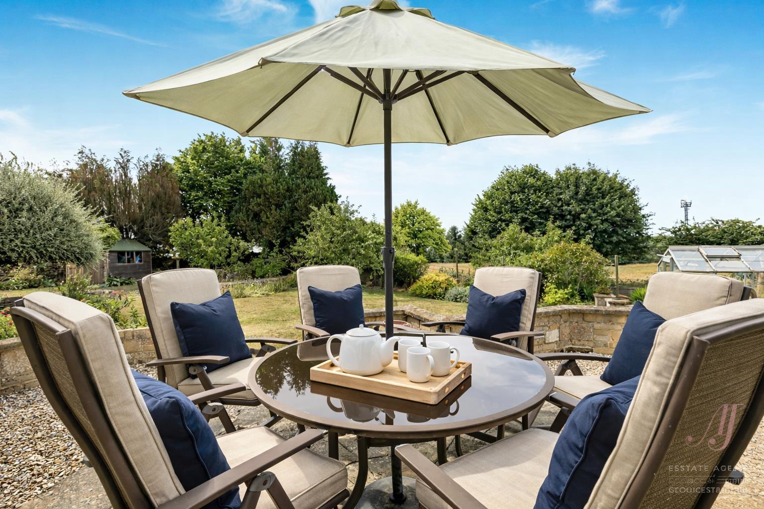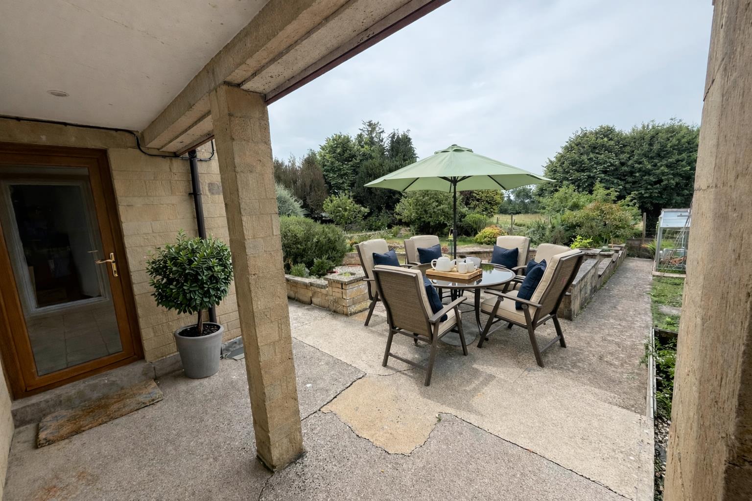 A generous lawn sits beyond the terrace, surrounded by mature shrubs, established trees, and planting that brings colour through the year.